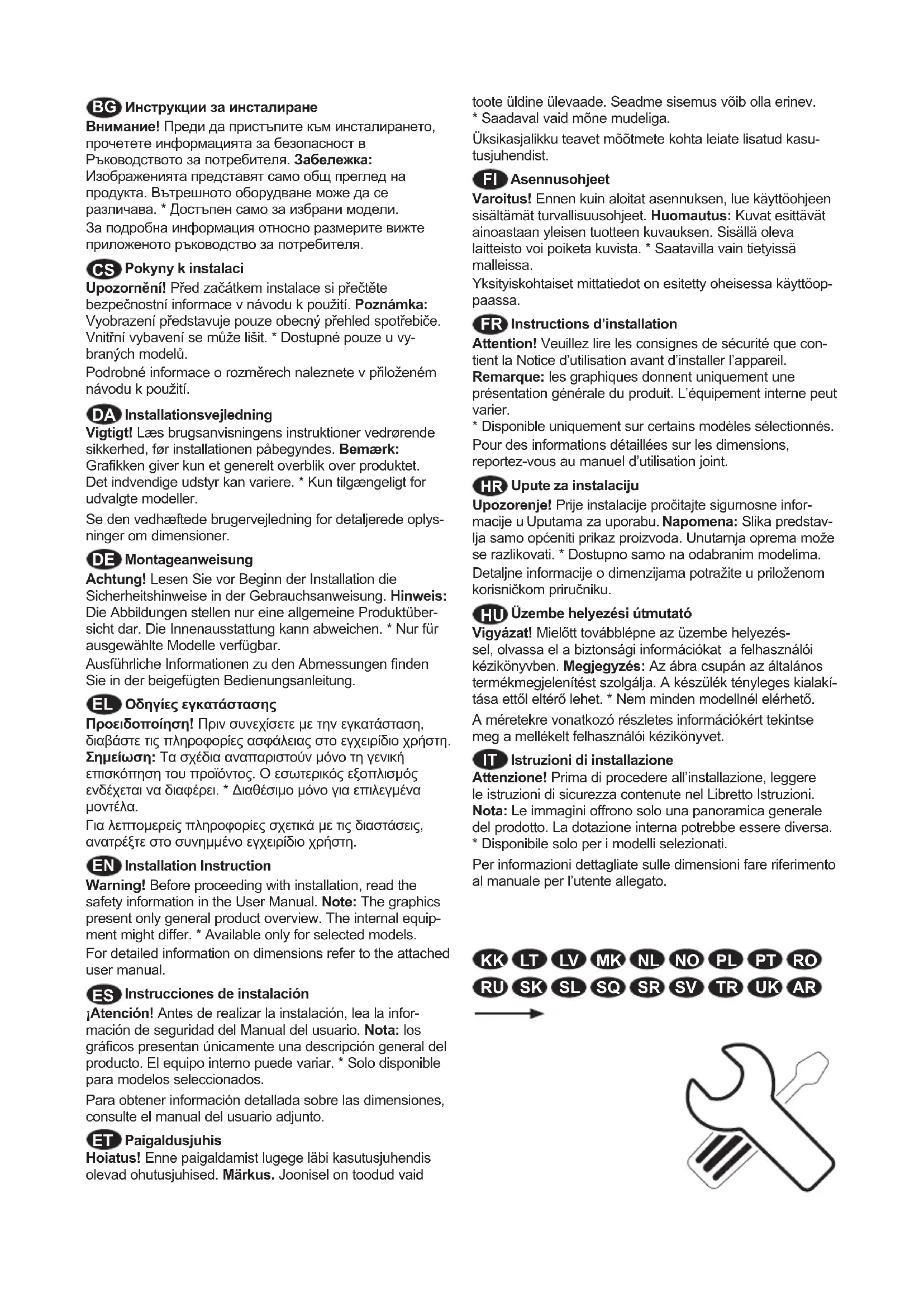 Instructions d’installation Attention! Veuillez lire les consignes de sécurité que con- tient la Notice d’utilisation avant d’installer l’appareil. Remarque: les graphiques donnent uniquement une présentation générale du produit. L’équipement interne peut varier.