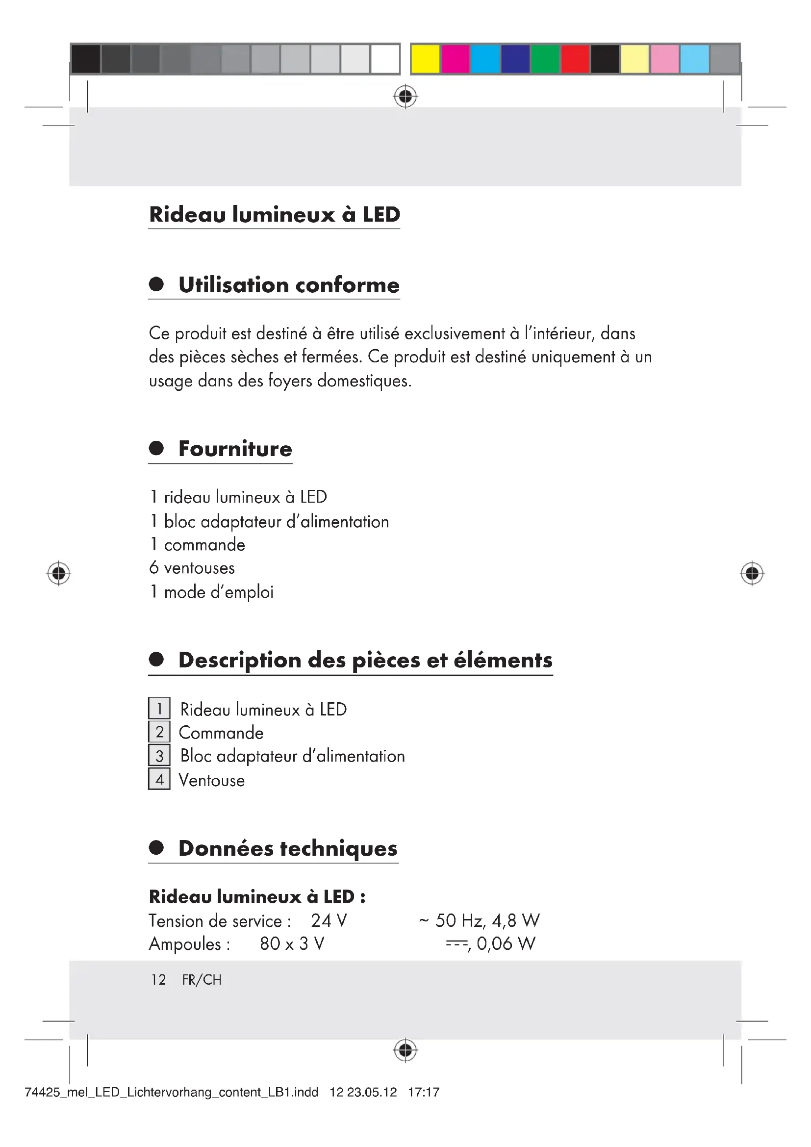 50 Hz, 4,8 W Ampoules: 80 x 3 V , 0,06 W 74425_mel_LED_Lichtervorhang_content_LB1.indd 12 23.05.12 17:1713 FR/CH AVIS: Les ampoules ne peuvent être remplacées. Classe de protection: Rideau lumineux à DEL (n° de modèle Z30253) certifié TÜV/GS Bloc d’alimentation: Tension nominale primaire: 230 V