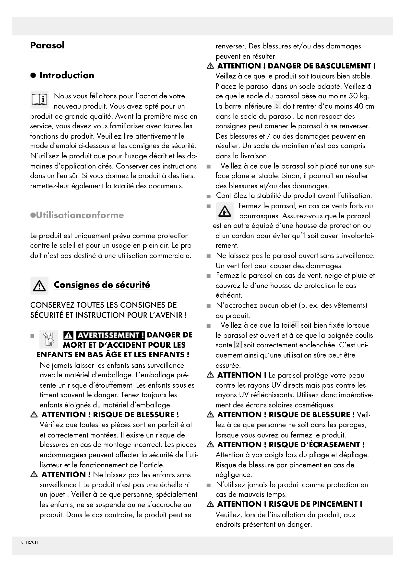 ENFANTS EN BAS ÂGE ET LES ENFANTS ! Ne jamais laisser les enfants sans surveillance avec le matériel d’emballage. L‘emballage pré- sente un risque d‘étouffement. Les enfants sous-es- timent souvent le danger. Tenez toujours les enfants éloignés du matériel d’emballage. ATTENTION ! RISQUE DE BLESSURE ! Vérifiez que toutes les pièces sont en parfait état et correctement montées. Il existe un risque de blessures en cas de montage incorrect. Les pièces endommagées peuvent affecter la sécurité de l‘uti- lisateur et le fonctionnement de l‘article. ATTENTION ! Ne laissez pas les enfants sans surveillance! Le produit n’est pas une échelle ni un jouet ! Veiller à ce que personne, spécialement les enfants, ne se suspende ou ne s’accroche au produit. Dans le cas contraire, le produit peut se renverser. Des blessures et/ou des dommages peuvent en résulter. ATTENTION ! DANGER DE BASCULEMENT! Veillez à ce que le produit soit toujours bien stable. Placez le parasol dans un socle adapté. Veillez à ce que le socle du parasol pèse au moins 50 kg. La barre inférieure