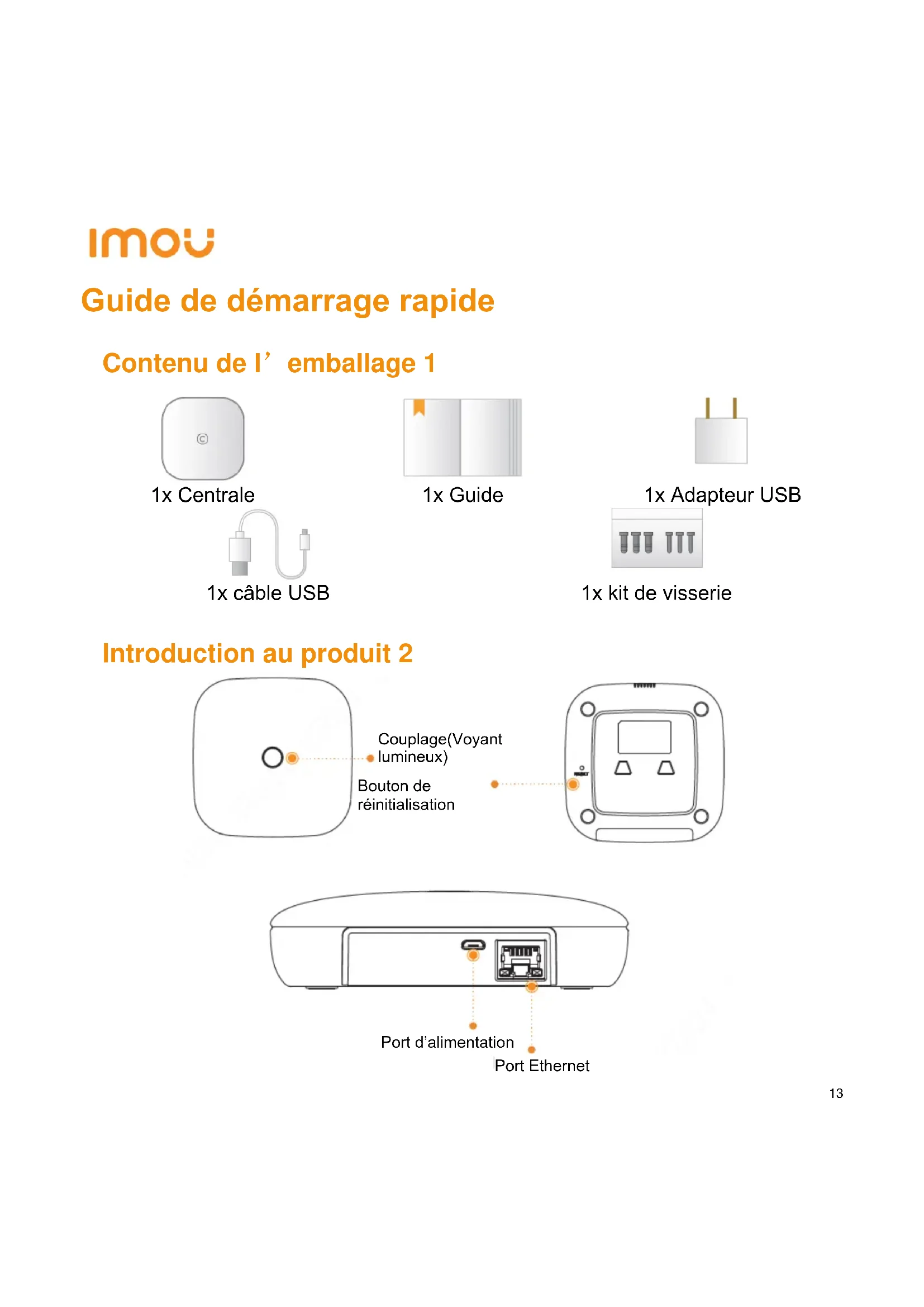 Introduction au produit 2 Couplage(Voyant lumineux) Bouton de réinitialisation Port d’alimentation Port Ethernet14 Nom Description Couplage Appuyez et maintenez enfoncé le bouton pendant plus de 5 secondes pour accéder au mode de couplage du réseau de point d’accès (AP). Voyant Allumé en rouge Démarrage Allumé en bleu Fonctionnement normal Clignotement lent en bleu Accès – Mode de couplage du réseau Wi-Fi Clignotement rapide en bleu Accès au mode de couplage du détecteur Clignotement lent en rouge Erreur réseau Clignotement rapide en rouge Alarme Clignotement alterné en rouge et en bleu Mise à niveau Réinitialisation Réinitialisez l’appareil à l’état d’origine. À la mise sous tension de l’appareil, appuyez sur le bouton de réinitialisation pendant 6 s. Dès que vous entendez un bip, relâchez le bouton de réinitialisation pour restaurer les paramètres d’usine par défaut. Tableau 2-1 Utilisation de l’application Imou 3 Ajouter la centrale d’alarme Étape 1 Scannez le code QR ci-après ou recherchez « Imou » dans Google Play ou dans l’App Store, puis téléchargez et installez l’application. Remarque : Si vous avez installé l’application, veillez à ce qu’elle soit mise à jour à la version la plus récente.15
