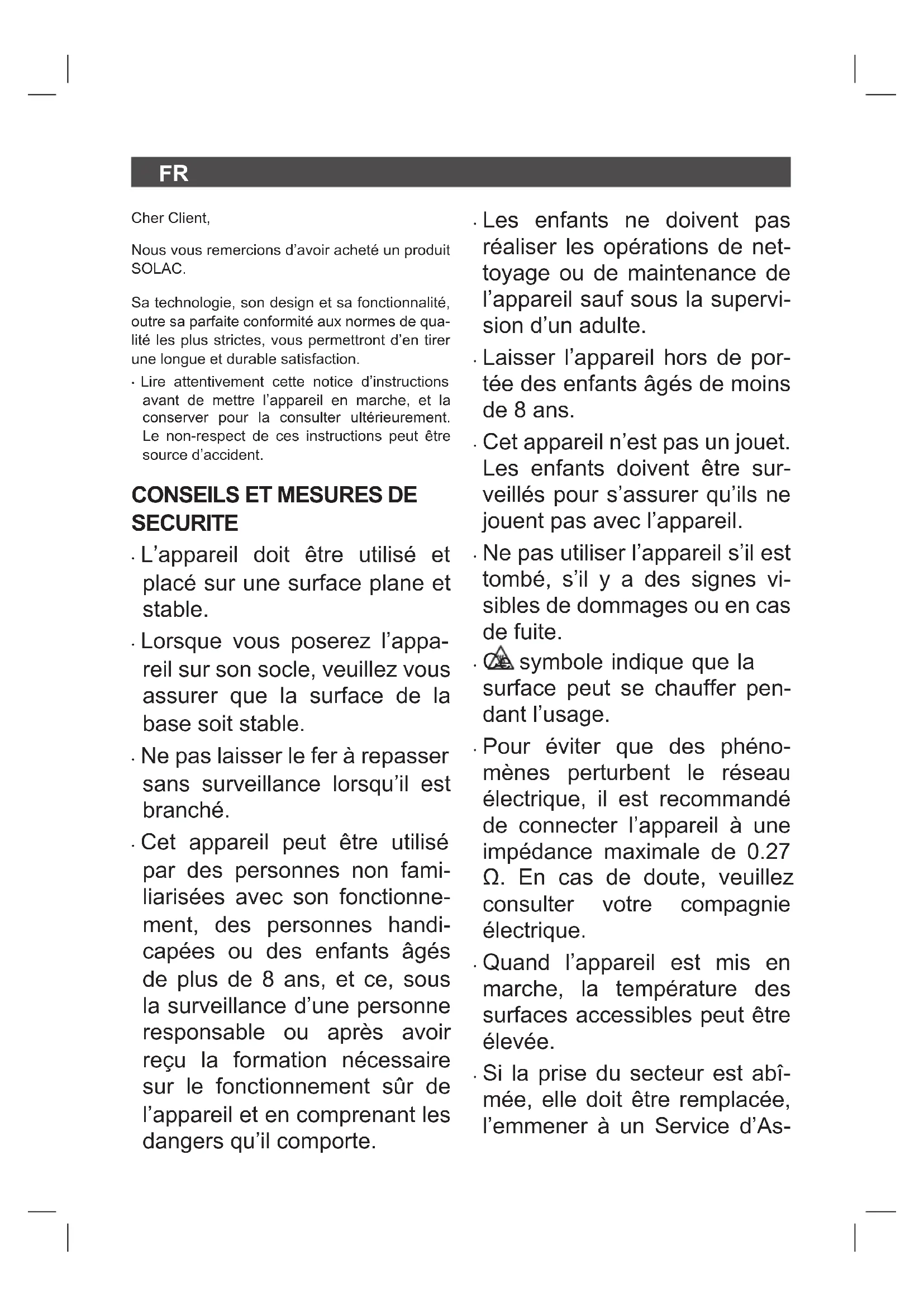 TECHNIQUE Ce produit est reconnu et protégé par la garantie établie conformément à la législation en vigueur. Pour faire valoir vos droits ou intérêts, vous de- vrez vous adresser à l’un de nos services d’as- sistance technique agréés. Pour savoir lequel est le plus proche, vous pou- vez accéder au lien suivant : http://solac.com Vous pouvez aussi nous contacter pour toute information. Vous pouvez télécharger ce manuel d’instruc- tions et ses mises à jour sur http://solac.com
