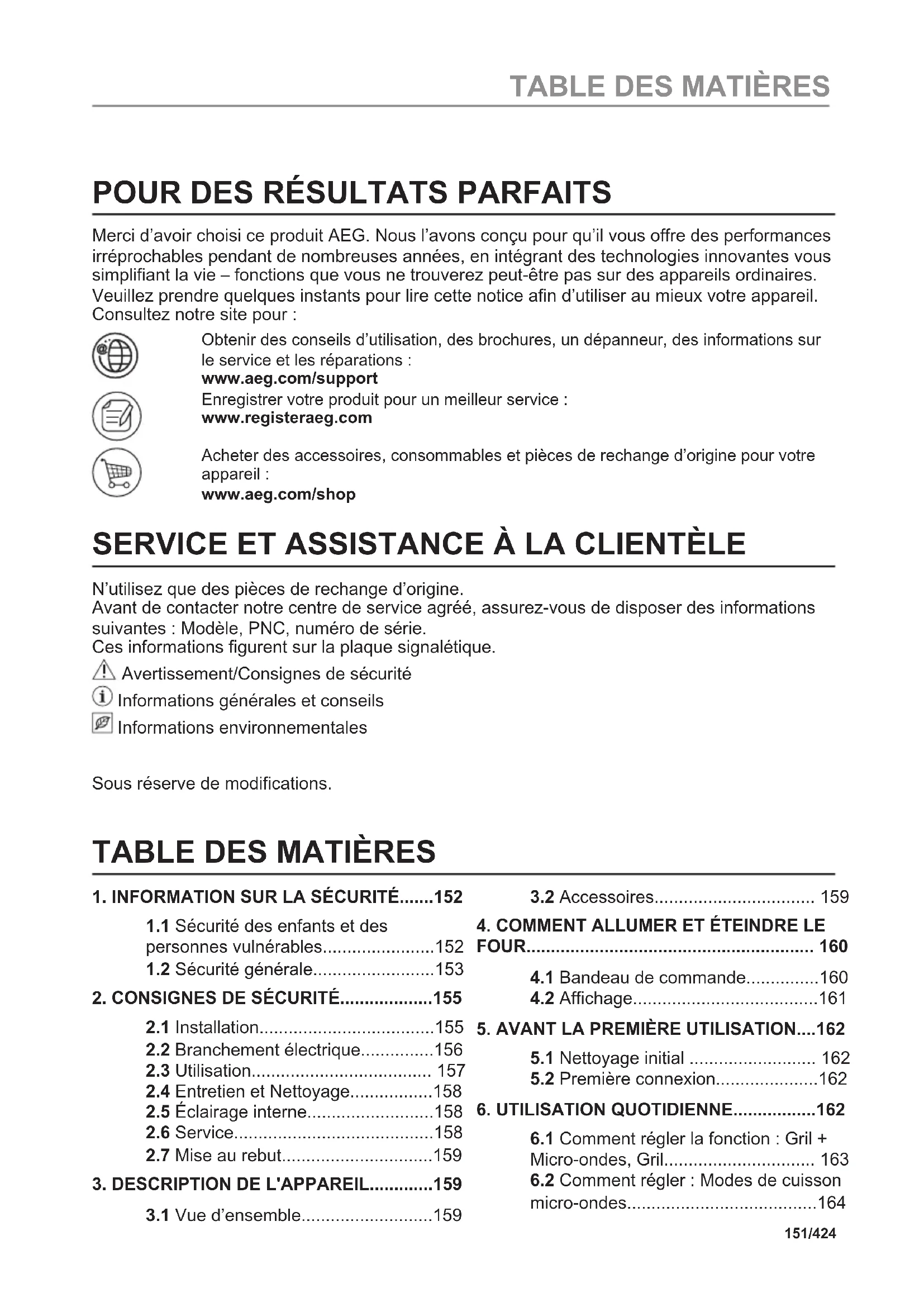 Recicle los materiales con el símbolo . Coloque el material de embalaje en los contenedores adecuados para su reciclaje. Ayude a proteger el medio ambiente y la salud pública, así como a reciclar residuos de aparatos eléctricos y electrónicos. No deseche los aparatos marcados con el símbolo junto con los residuos domésticos. Lleve el producto a su centro de reciclaje local o póngase en contacto con su oficina municipal. 150/424 ¡ES FÁCIL!POUR DES RÉSULTATS PARFAITS Merci d’avoir choisi ce produit AEG. Nous l’avons conçu pour qu’il vous offre des performances irréprochables pendant de nombreuses années, en intégrant des technologies innovantes vous simplifiant la vie – fonctions que vous ne trouverez peut-être pas sur des appareils ordinaires. Veuillez prendre quelques instants pour lire cette notice afin d’utiliser au mieux votre appareil. Consultez notre site pour : Obtenir des conseils d’utilisation, des brochures, un dépanneur, des informations sur le service et les réparations : www.aeg.com/support Enregistrer votre produit pour un meilleur service : www.registeraeg.com Acheter des accessoires, consommables et pièces de rechange d’origine pour votre appareil : www.aeg.com/shop