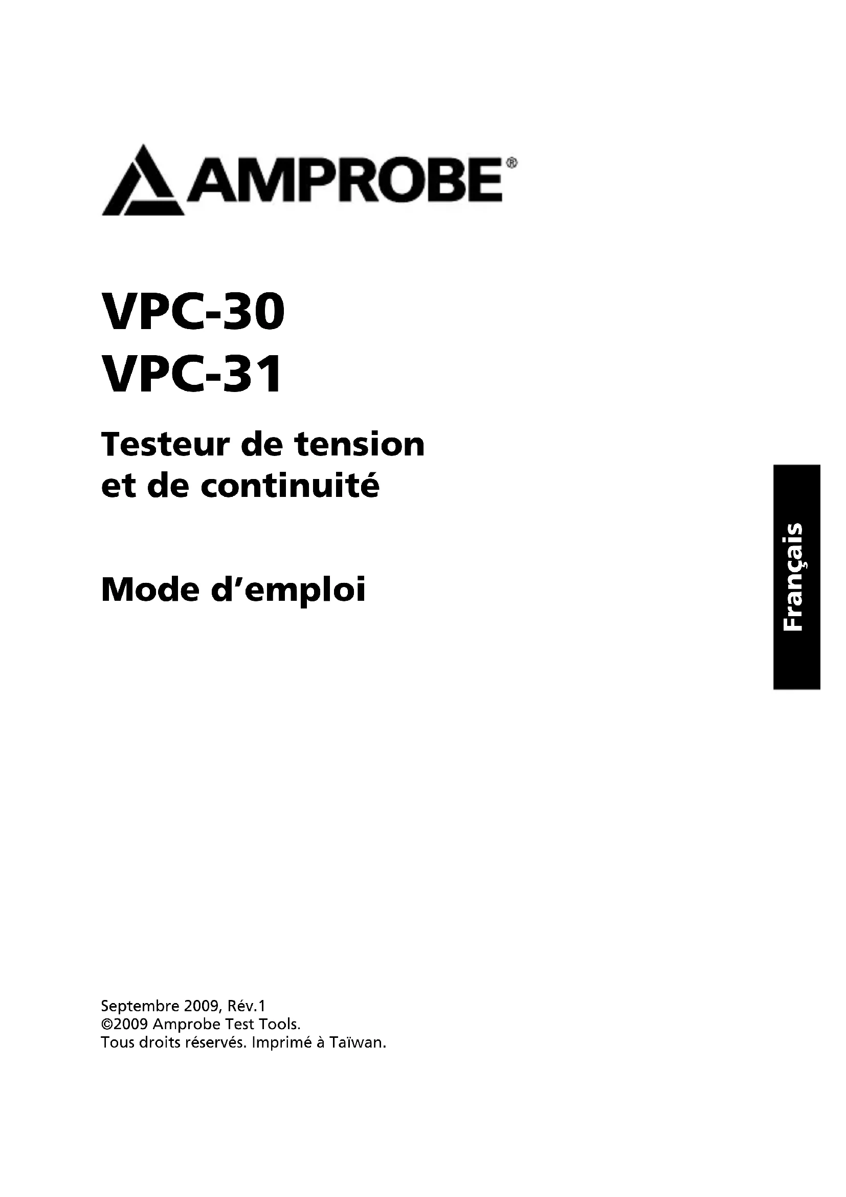 procedure. Except for the replacement of the battery, repair of the meter should be performed only by a Factory Authorized Service Center or by other qualified instrument service personnel. The front panel and case can be cleaned with a mild solution of detergent and water. Apply sparingly with a soft cloth and allow to dry completely before using. Do not use aromatic hydrocarbons or chlorinated solvents for cleaning.13 Fig.1 Fig.3 Fig.4 Fig.2VPC-30 VPC-31 Testeur de tension et de continuité Mode d’emploi Septembre 2009, Rév.1 ©2009 Amprobe Test Tools. Tous droits réservés. Imprimé à Taïwan. FrançaisLimites de garantie et de responsabilité Amprobe garantit l’absence de vices de matériaux et de fabrication de ce produit pendant une période d’un an prenant effet à la date d’achat. Cette garantie ne s’applique pas aux fusibles, aux piles jetables ni à tout produit mal utilisé, modifié, contaminé, négligé ou endommagé par accident ou soumis à des conditions anormales d’utilisation et de manipulation. Les revendeurs n’ont pas l’autorisation de prolonger toute autre garantie au nom d’Amprobe. Pour bénéficier de la garantie, renvoyez le produit accompagné d’un justificatif d’achat auprès d’un centre de services agréé par Amprobe Test Tools ou d’un distributeur ou d’un revendeur Amprobe. Voir la section Réparation pour tous les détails. LA PRESENTE GARANTIE EST LE SEUL ET EXCLUSIF RECOURS DE L’UTILISATEUR. TOUTES AUTRES GARANTIES, EXPLICITES, IMPLICITES OU STATUTAIRES, NOTAMMENT LES GARANTIES DE QUALITE MARCHANDE OU D’ADAPTATION A UN OBJECTIF PARTICULIER SONT EXCLUES PAR LES PRESENTES. LE FABRICANT NE SERA EN AUCUN CAS TENU RESPONSABLE DE DOMMAGES PARTICULIERS, INDIRECTS, ACCIDENTELS OU CONSECUTIFS, NI D’AUCUNS DEGATS OU PERTES DE DONNEES, SUR UNE BASE CONTRACTUELLE, EXTRA-CONTRACTUELLE OU AUTRE. Etant donné que certaines juridictions n’admettent pas les limitations d’une condition de garantie implicite ou l’exclusion ou la limitation de dégâts accidentels ou consécutifs, il se peut que les limitations et les exclusions de cette garantie ne s’appliquent pas à votre cas. Réparation Tous les outils de test renvoyés pour être réparés au titre de la garantie doivent être accompagnés des éléments suivants : nom, raison sociale, adresse, numéro de téléphone et justificatif d’achat. Ajoutez également une brève description du problème ou du service demandé et incluez les cordons de test avec l’appareil. Les frais de remplacement ou de réparation hors garantie doivent être acquittés par chèque, mandat, carte de crédit avec date d’expiration, ou par bon de commande payable à l’ordre de Amprobe