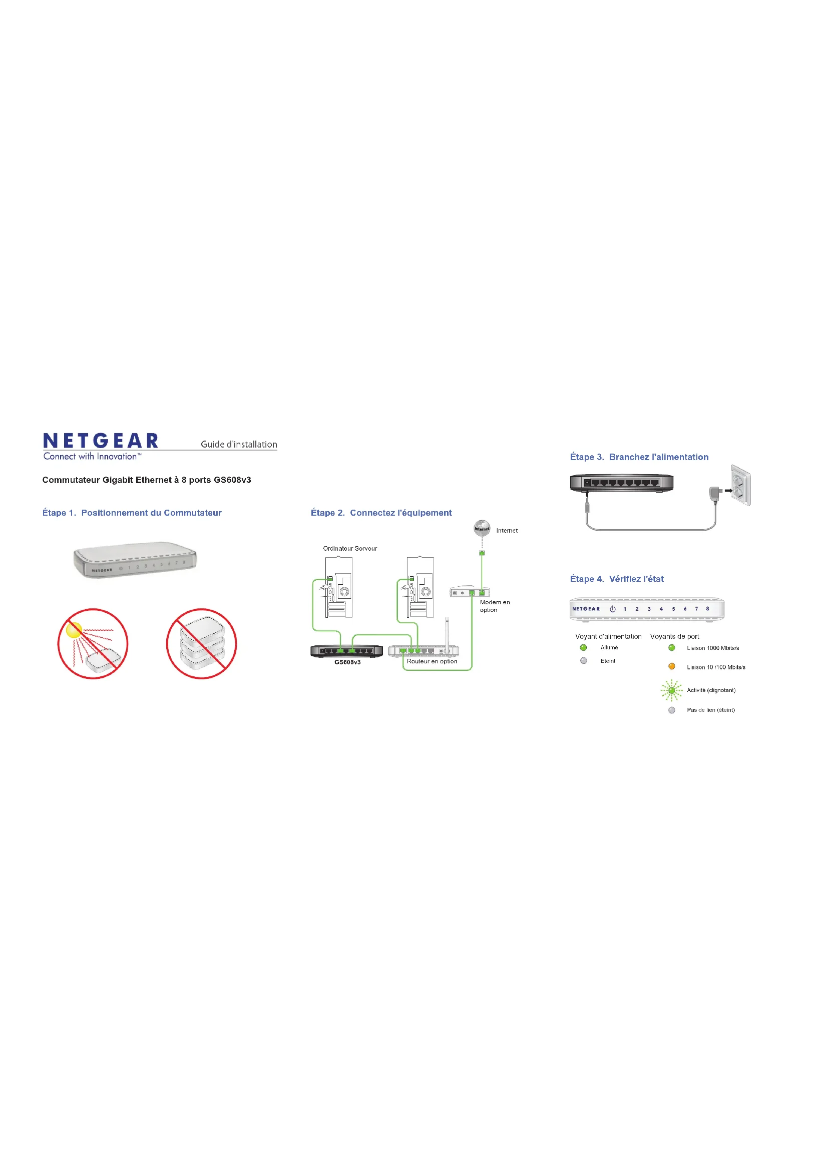 Allumé Eteint Voyant d'alimentation Activité (clignotant) Pas de lien (éteint) Liaison 1000 Mbits/s Liaison 10 /100 Mbits/s Voyants de port Étape 1. Positionnement du Commutateur Étape 3. Branchez l'alimentation Étape 4. Vérifiez l'état Étape 2. Connectez l'équipement GS608v3 Routeur en option Internet Ordinateur Serveur Guide d'installation Modem en option Commutateur Gigabit Ethernet à 8 ports GS608v3Septembre 2012 Ce symbole a été apposé conformément à la directive européenne 2002/96 sur la mise au rebut des équipements électriques et électroniques (directive WEEE - Waste Electrical and Electronic Equipment). En cas de mise au rebut de ce produit dans un État membre de l'Union européenne, il doit être traité et recyclé conformément à cette directive. NETGEAR, le logo NETGEAR et Connect with Innovation sont des marques commerciales et/ou des marques déposées de NETGEAR, Inc. et/ou des filiales de NETGEAR aux Etats-Unis et/ou dans d'autres pays. Les informations sont sujettes à changement sans préavis. Les autres marques et noms de produits sont des marques commerciales ou des marques déposées de leurs détenteurs respectifs. © NETGEAR, Inc. Tous droits réservés. Pour une utilisation en intérieur dans tous les pays de l'UE et la Suisse.