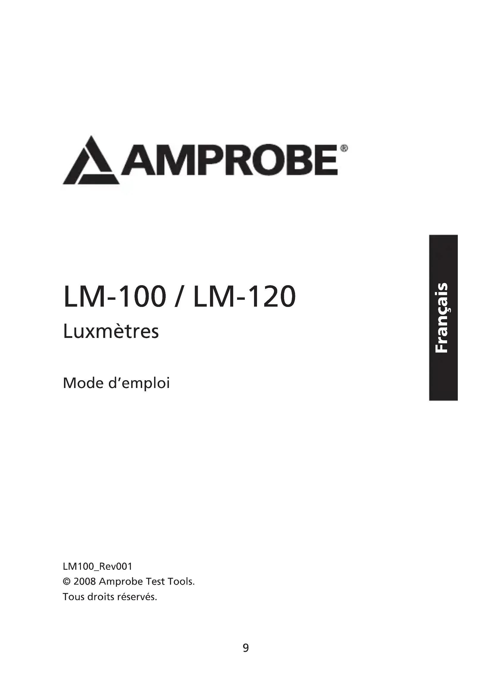 If there appears to be a malfunction during the operation of the meter, the following steps should be performed in order to isolate the cause of the problem. Check the battery. Replace the battery immediately when the symbol 1. “” appears on the LCD. Review the operating instructions for possible mistakes in operating 2. procedure. Except for the replacement of the battery, repair of the meter should be performed only by a Factory Authorized Service Center or by other qualified8 instrument service personnel. The front panel and case can be cleaned with a mild solution of detergent and water. Apply sparingly with a soft cloth and allow to dry completely before using. Do not use aromatic hydrocarbons or chlorinated solvents for cleaning. battery Replacement Turn off the meter and slide out the battery cover. Replace the battery 1. with a NEDA type 1604 or equivalent 9V alkaline battery. Replace the cover. Remove battery when the LM-100 / LM-120 is not used for extended 2. period. Battery Replacement OPEN9 LM100_Rev001© 2008 Amprobe Test Tools.Tous droits réservés. LM-100 / LM-120 Luxmètres Mode d’emploi Français10 Limites de garantie et de responsabilité Amprobe garantit l’absence de vices de matériaux et de fabrication de ce produit pendant une période d’un (1) an prenant effet à la date d’achat. Cette garantie ne s’applique pas aux fusibles, aux piles jetables ni à tout produit mal utilisé, modifié, contaminé, négligé ou endommagé par accident ou soumis à des conditions anormales d’utilisation et de manipulation. Les distributeurs agréés par Amprobe ne sont pas autorisés à appliquer une garantie plus étendue au nom d’Amprobe. Pour bénéficier de la garantie, renvoyez le produit accompagné d’un justificatif d’achat auprès d’un centre de services agréé par Amprobe Test Tools ou d’un distributeur ou d’un revendeur Amprobe. Voir la section Réparation pour tous les détails. LA PRESENTE GARANTIE EST LE SEUL ET EXCLUSIF RECOURS. TOUTES AUTRES GARANTIES, EXPLICITES, IMPLICITES OU STATUTAIRES, NOTAMMENT LE CAS ECHEANT LES GARANTIES DE QUALITE MARCHANDE OU D’ADAPTATION A UN OBJECTIF PARTICULIER, SONT EXCLUES PAR LES PRESENTES. LE FABRICANT NE SERA EN AUCUN CAS TENU RESPONSABLE DES DOMMAGES PARTICULIERS, INDIRECTS, ACCIDENTELS OU CONSECUTIFS, NI D’AUCUNS DEGATS OU PERTES DE DONNEES, SUR UNE BASE CONTRACTUELLE, EXTRA-CONTRACTUELLE OU AUTRE. Etant donné que certaines juridictions n’admettent pas les limitations d’une condition de garantie implicite, ou l’exclusion ou la limitation de dégâts accidentels ou consécutifs, il se peut que les limitations et/ou les exclusions de cette garantie ne s’appliquent pas à votre cas. Réparation Tous les outils de test renvoyés pour une réparation ou un étalonnage couvert ou non par la garantie doivent être accompagnés des éléments suivants : nom, raison sociale, adresse, numéro de téléphone et justificatif d’achat. Ajoutez également une brève description du problème ou du service demandé et incluez les cordons de mesure avec l’appareil. Les frais de remplacement ou de réparation hors garantie doivent être acquittés par chèque, mandat, carte de crédit avec date d’expiration ou par bon de commande payable à l’ordre de Amprobe
