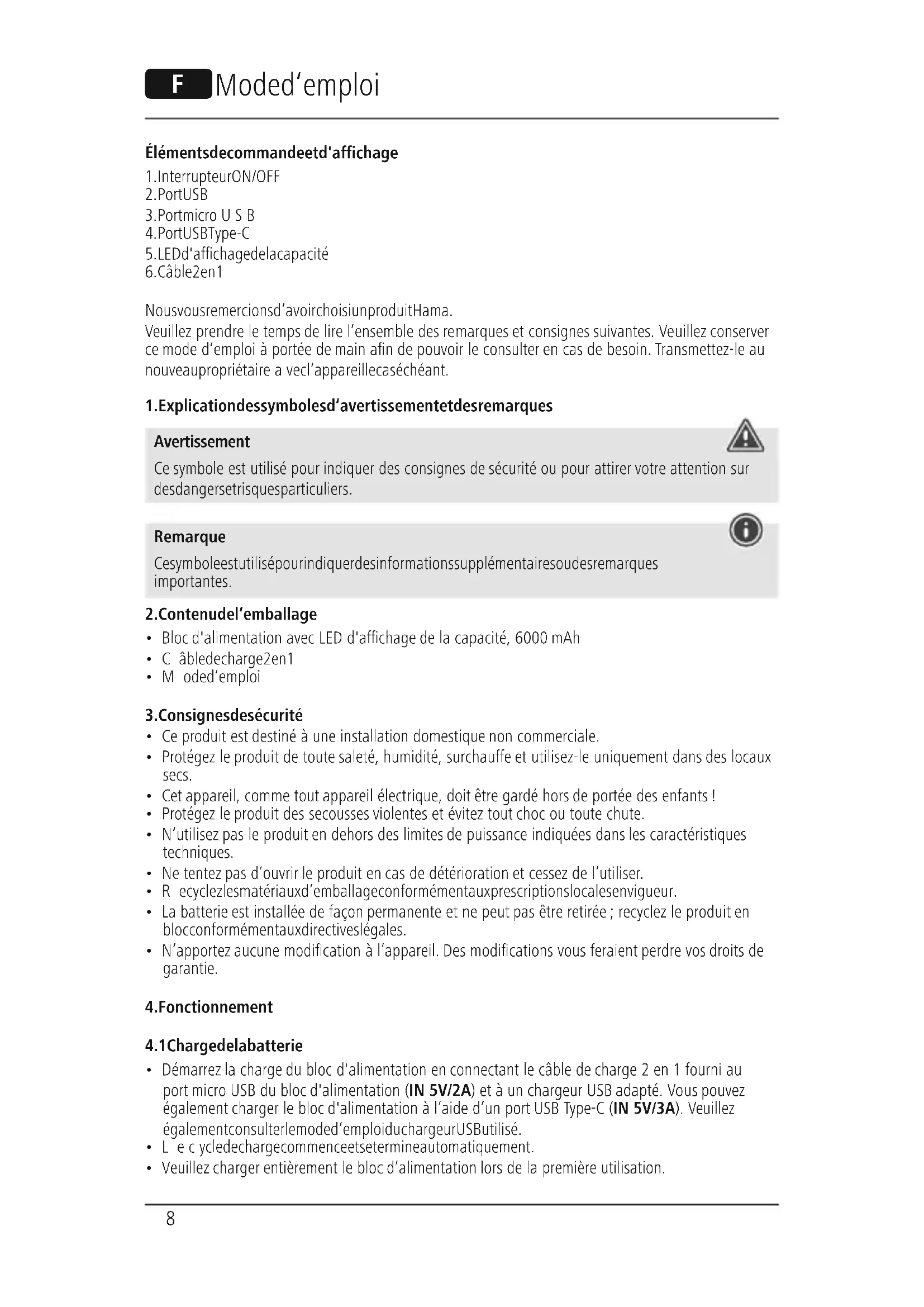- Veuillez charger entièrement le bloc d‘alimentation lors de la premièreutilisation. F Mode d‘emploi9 Remarque –Capacité