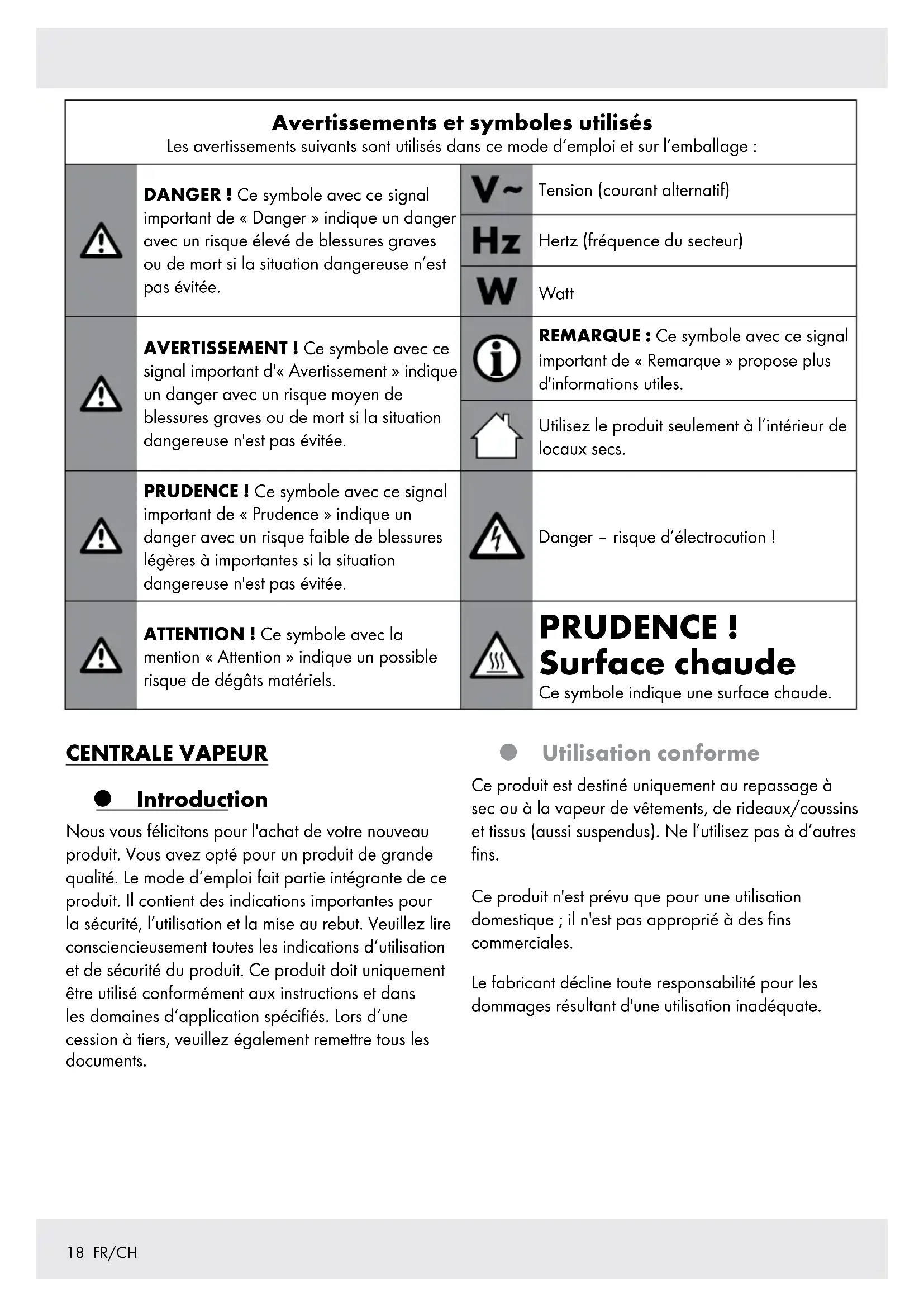| Avertissements et symboles utilisés Les avertissements suivants sont utilisés dans ce mode d'emploi et sur l'emballage: | |||
