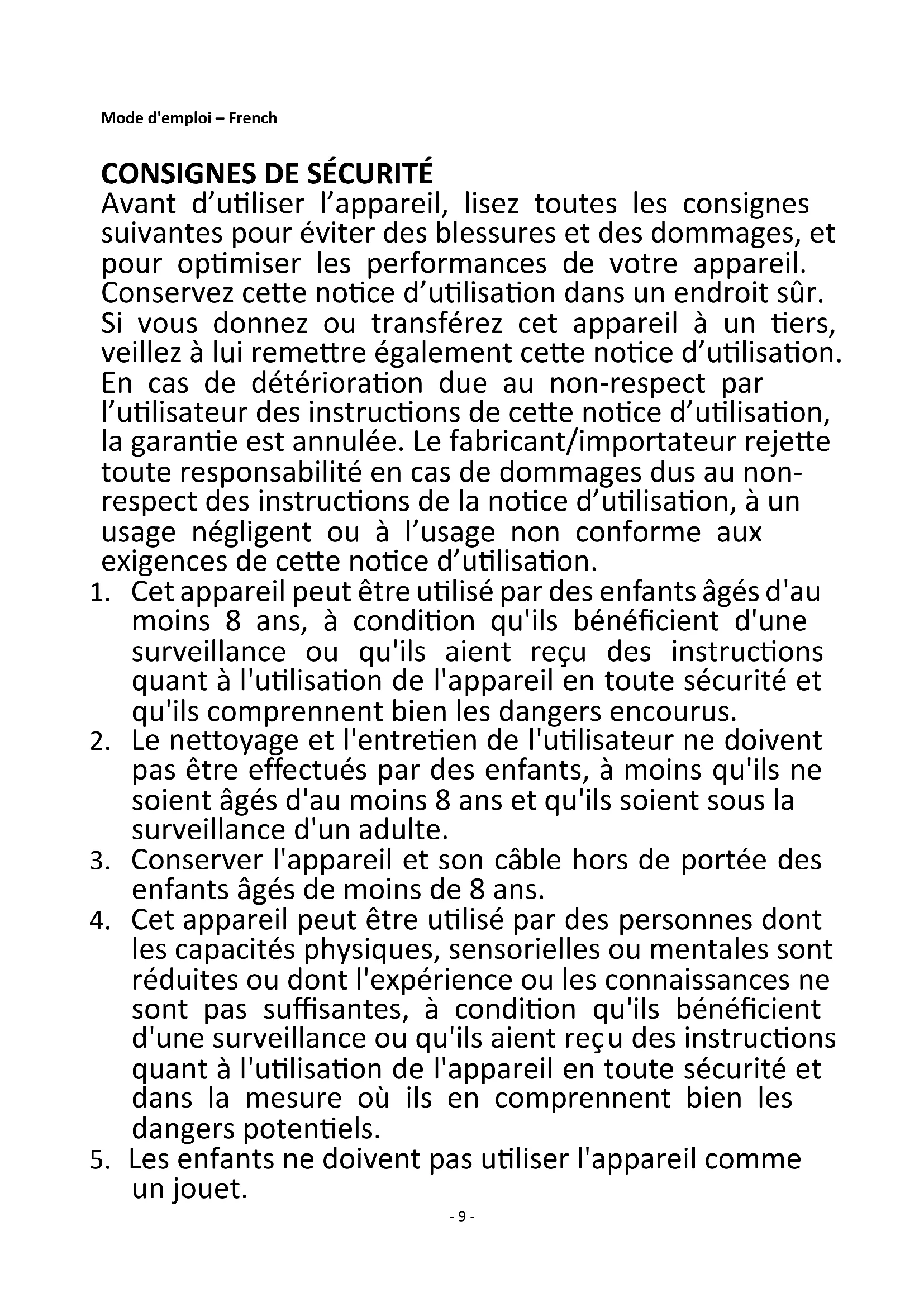 Avant d’utiliser l’appareil, lisez toutes les consignes suivantes pour éviter des blessures et des dommages, et pour optimiser les performances de votre appareil. Conservez cette notice d’utilisation dans un endroit sûr. Si vous donnez ou transférez cet appareil à un tiers, veillez à lui remettre également cette notice d’utilisation. En cas de détérioration due au non-respect par l’utilisateur des instructions de cette notice d’utilisation, la garantie est annulée. Le fabricant/importateur rejette toute responsabilité en cas de dommages dus au non- respect des instructions de la notice d’utilisation, à un usage négligent ou à l’usage non conforme aux exigences de cette notice d’utilisation.