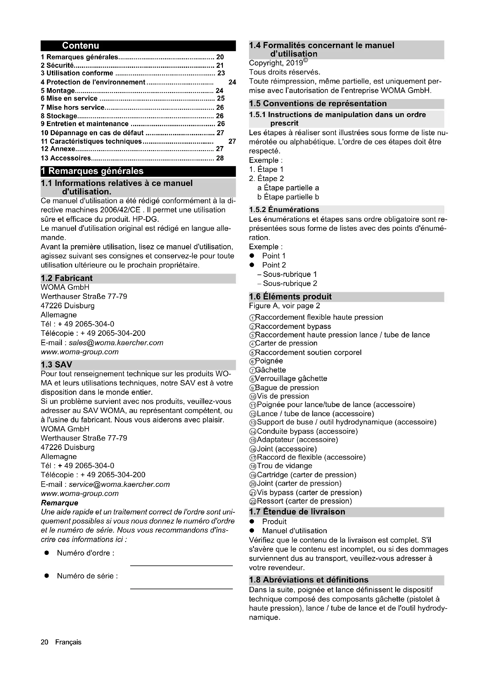 Pour tout renseignement technique sur les produits WO- MA et leurs utilisations techniques, notre SAV est à votre disposition dans le monde entier. Si un problème survient avec nos produits, veuillez-vous adresser au SAV WOMA, au représentant compétent, ou à l'usine du fabricant. Nous vous aiderons avec plaisir. WOMA GmbH Werthauser Straße 77-79 47226 Duisburg Allemagne Tél : + 49 2065-304-0 Télécopie : + 49 2065-304-200 E-mail : service@woma.kaercher.com www.woma-group.com Remarque Une aide rapide et un traitement correct de l'ordre sont uni- quement possibles si vous nous donnez le numéro d'ordre et le numéro de série. Nous vous recommandons d'ins- crire ces informations ici :