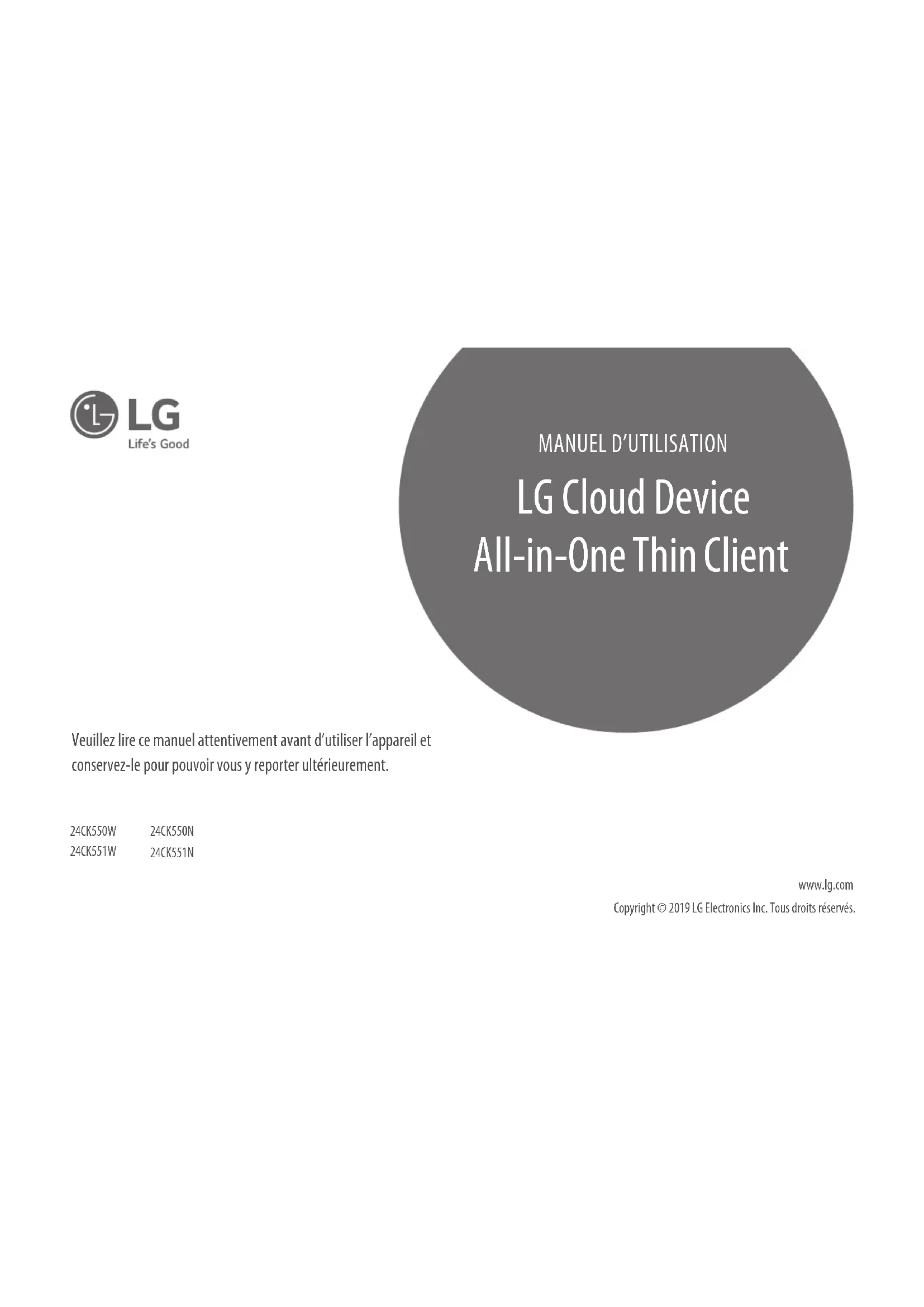 LG Cloud Device All-in-One Thin Client www.lg.com Copyright © 2019 LG Electronics Inc. Tous droits réservés. 24CK550W 24CK551W 24CK550N 24CK551N2 FRANÇAIS LICENCE Chaque modèle dispose de licences différentes. Consultez le site www.lg.com pour en savoir plus sur les licences. Les termes HDMI et HDMI High-Definition Multimedia Interface, de même que le logo HDMI sont des marques commerciales ou des marques déposées de HDMI Licensing Administrator, Inc. aux États-Unis et dans d’autres pays. MaxxAudio and additional MAXX trademarks are trademarks and/ or registered trademarks of Waves Audio Ltd. The SuperSpeed USB Trident logo is a registered trademark of USB Implementers Forum, Inc.