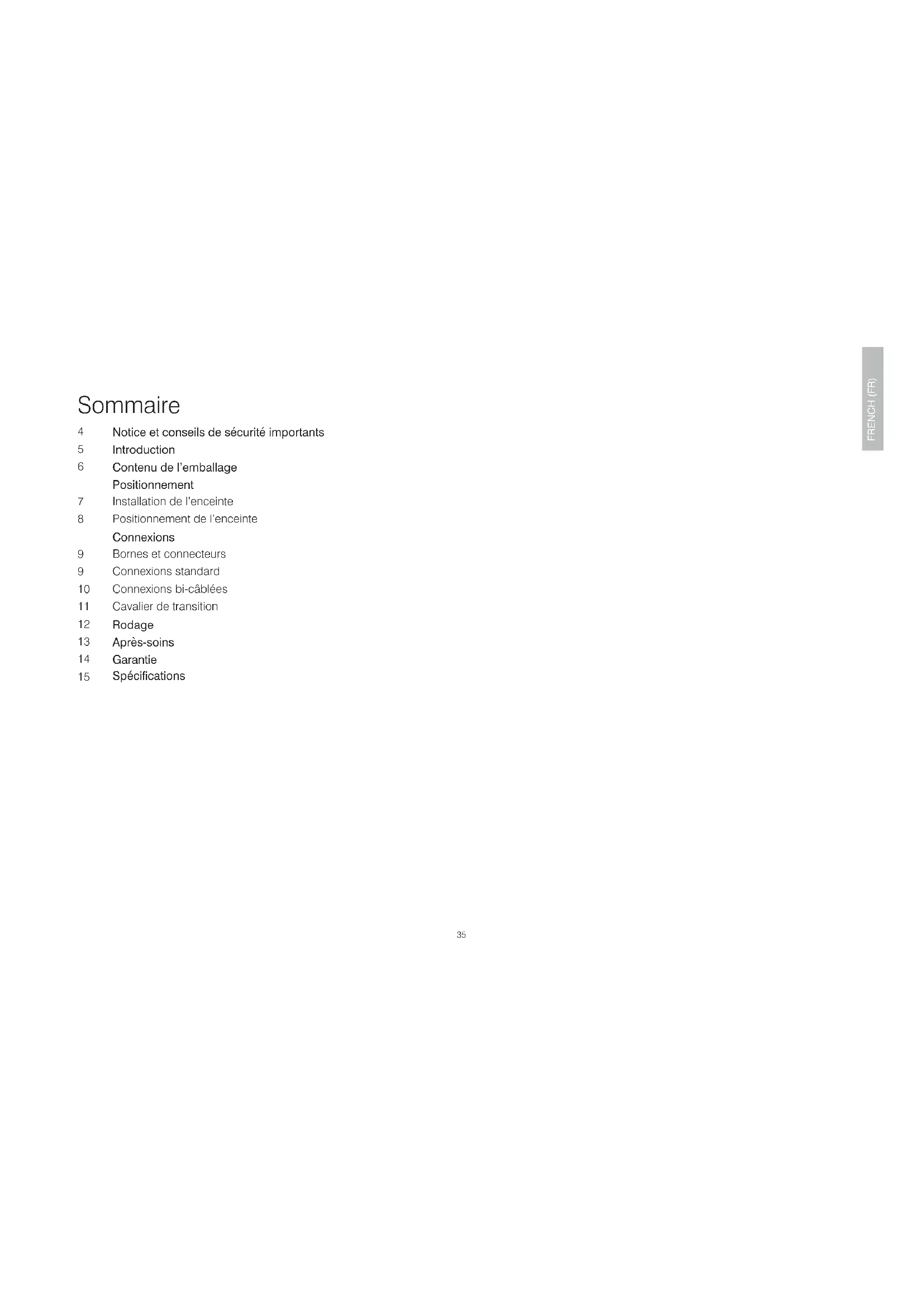 SWEDISHSV 16135 FRENCH (FR) Notice et conseils de sécurité importants Introduction Contenu de l’emballage Positionnement Installation de l’enceinte Positionnement de l’enceinte Connexions Bornes et connecteurs Connexions standard Connexions bi-câblées Cavalier de transition Rodage Après-soins Garantie Spécications Sommaire