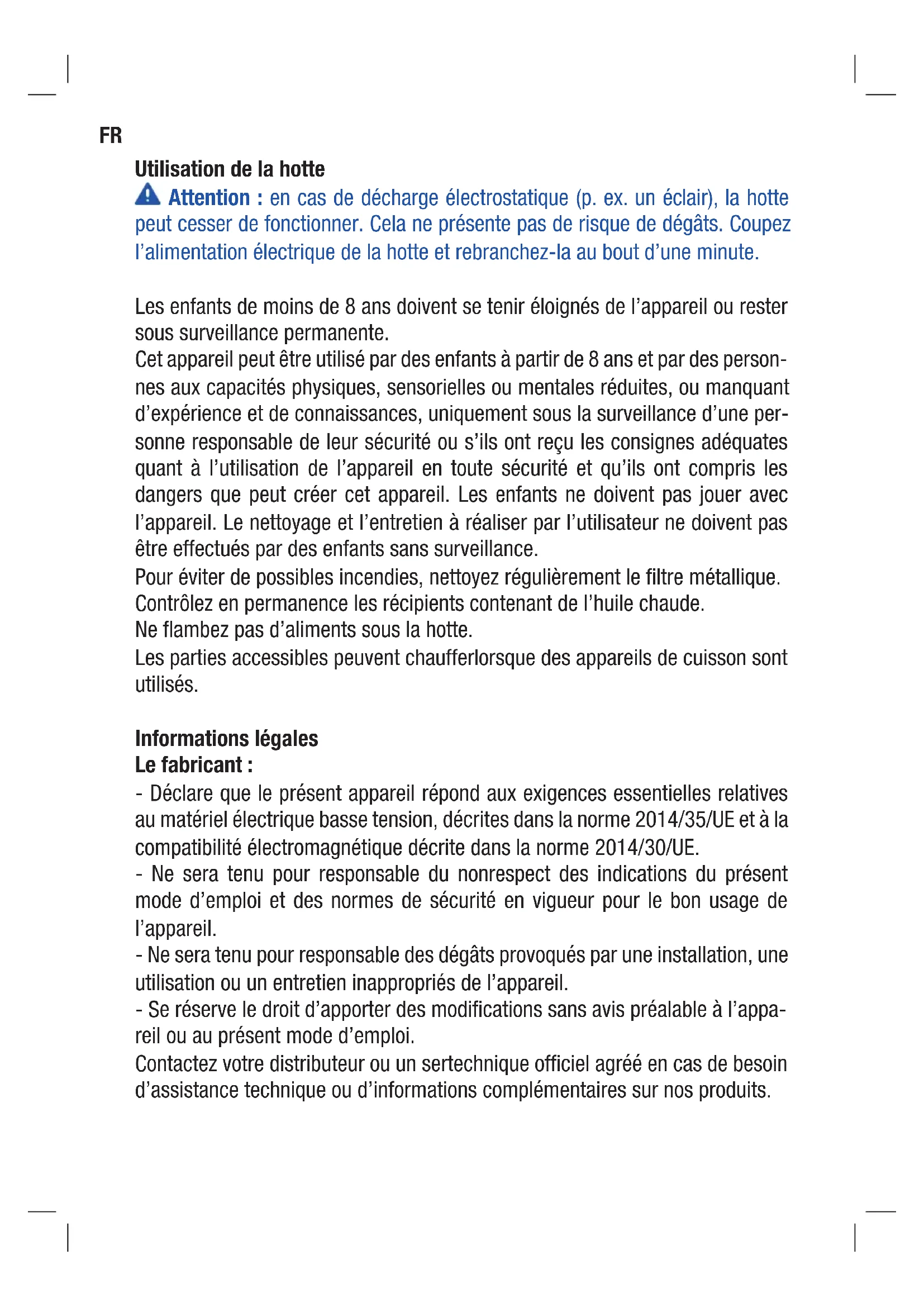 - Incidencias derivadas de una rotura física, no atribuible a un defecto de fabricación (carcasas, cristales, embellecedores, plásticos, filtros, mandos,…). La presente garantía no afecta a los derechos de que dispone el consumidor conforme a lo previsto según legislación vigente. El símbolo en el producto o en su embalaje indica que este producto no se puede tratar como desperdicios normales del hogar. Este producto se debe entregar al punto de recolec- ción de equipos eléctricos y electrónicos para reciclaje. Al asegurarse de que este producto se deseche correctamente, usted ayudará a evitar posibles consecuencias negativas para el ambiente y la salud pública, lo cual podría ocur-rir si este producto no se manipula de forma adecuada. Para obtener información más detallada sobre el reciclaje de este producto, póngase en contacto con la administración de su ciudad, con su servicio de desechos del hogar o con la tienda donde compró el producto.FR Utilisation de la hotte Attention : en cas de décharge électrostatique (p. ex. un éclair), la hotte peut cesser de fonctionner. Cela ne présente pas de risque de dégâts. Coupez l’alimentation électrique de la hotte et rebranchez-la au bout d’une minute. Les enfants de moins de 8 ans doivent se tenir éloignés de l’appareil ou rester sous surveillance permanente. Cet appareil peut être utilisé par des enfants à partir de 8 ans et par des person- nes aux capacités physiques, sensorielles ou mentales réduites, ou manquant d’expérience et de connaissances, uniquement sous la surveillance d’une per- sonne responsable de leur sécurité ou s’ils ont reçu les consignes adéquates quant à l’utilisation de l’appareil en toute sécurité et qu’ils ont compris les dangers que peut créer cet appareil. Les enfants ne doivent pas jouer avec l’appareil. Le nettoyage et l’entretien à réaliser par l’utilisateur ne doivent pas être effectués par des enfants sans surveillance. Pour éviter de possibles incendies, nettoyez régulièrement le filtre métallique. Contrôlez en permanence les récipients contenant de l’huile chaude. Ne flambez pas d’aliments sous la hotte. Les parties accessibles peuvent chaufferlorsque des appareils de cuisson sont utilisés. Informations légales Le fabricant : - Déclare que le présent appareil répond aux exigences essentielles relatives au matériel électrique basse tension, décrites dans la norme 2014/35/UE et à la compatibilité électromagnétique décrite dans la norme 2014/30/UE. - Ne sera tenu pour responsable du nonrespect des indications du présent mode d’emploi et des normes de sécurité en vigueur pour le bon usage de l’appareil. - Ne sera tenu pour responsable des dégâts provoqués par une installation, une utilisation ou un entretien inappropriés de l’appareil. - Se réserve le droit d’apporter des modifications sans avis préalable à l’appa- reil ou au présent mode d’emploi. Contactez votre distributeur ou un sertechnique officiel agréé en cas de besoin d’assistance technique ou d’informations complémentaires sur nos produits.FR