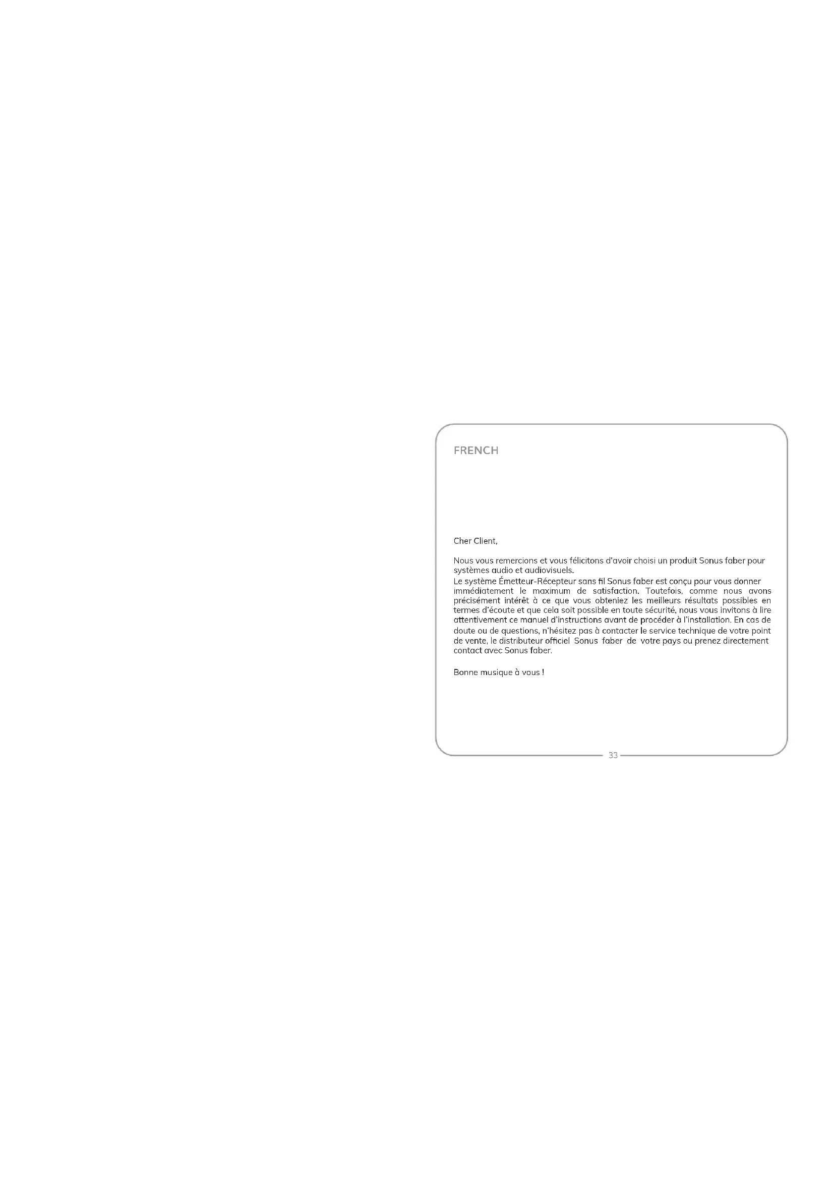 - SICHERHEIT DIN EN60950 - Einrichtungen der Informationstechnik - Sicherheit - Teil 1: Allgemeine Anforderungen Arcugnano, Februar 2019 Geschäftsführer Je Poggi33 FRENCH Cher Client, Nous vous remercions et vous félicitons d’avoir choisi un produit Sonus faber pour systèmes audio et audiovisuels. Le système Émetteur-Récepteur sans l Sonus faber est conçu pour vous donner immédiatement le maximum de satisfaction. Toutefois, comme nous avons précisément intérêt à ce que vous obteniez les meilleurs résultats possibles en termes d’écoute et que cela soit possible en toute sécurité, nous vous invitons à lire attentivement ce manuel d’instructions avant de procéder à l’installation. En cas de doute ou de questions, n’hésitez pas à contacter le service technique de votre point de vente, le distributeur ofciel Sonus faber de votre pays ou prenez directement contact avec Sonus faber. Bonne musique à vous !34 35