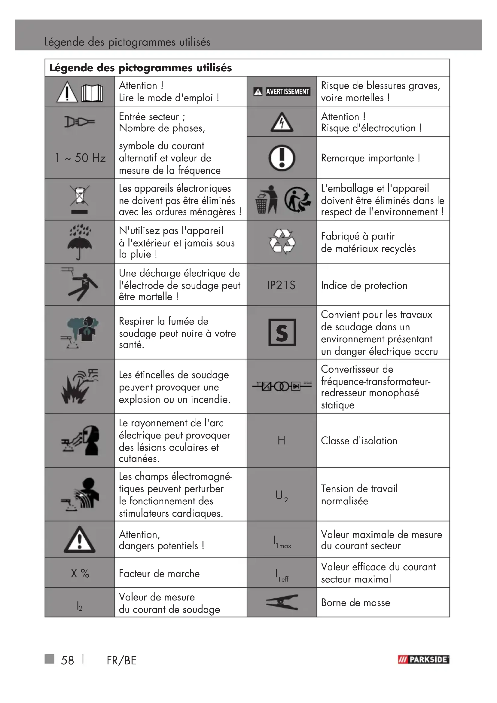Valeur de mesure du courant de soudage Borne de masse59FR/BE Légende des pictogrammes utilisés / Introduction