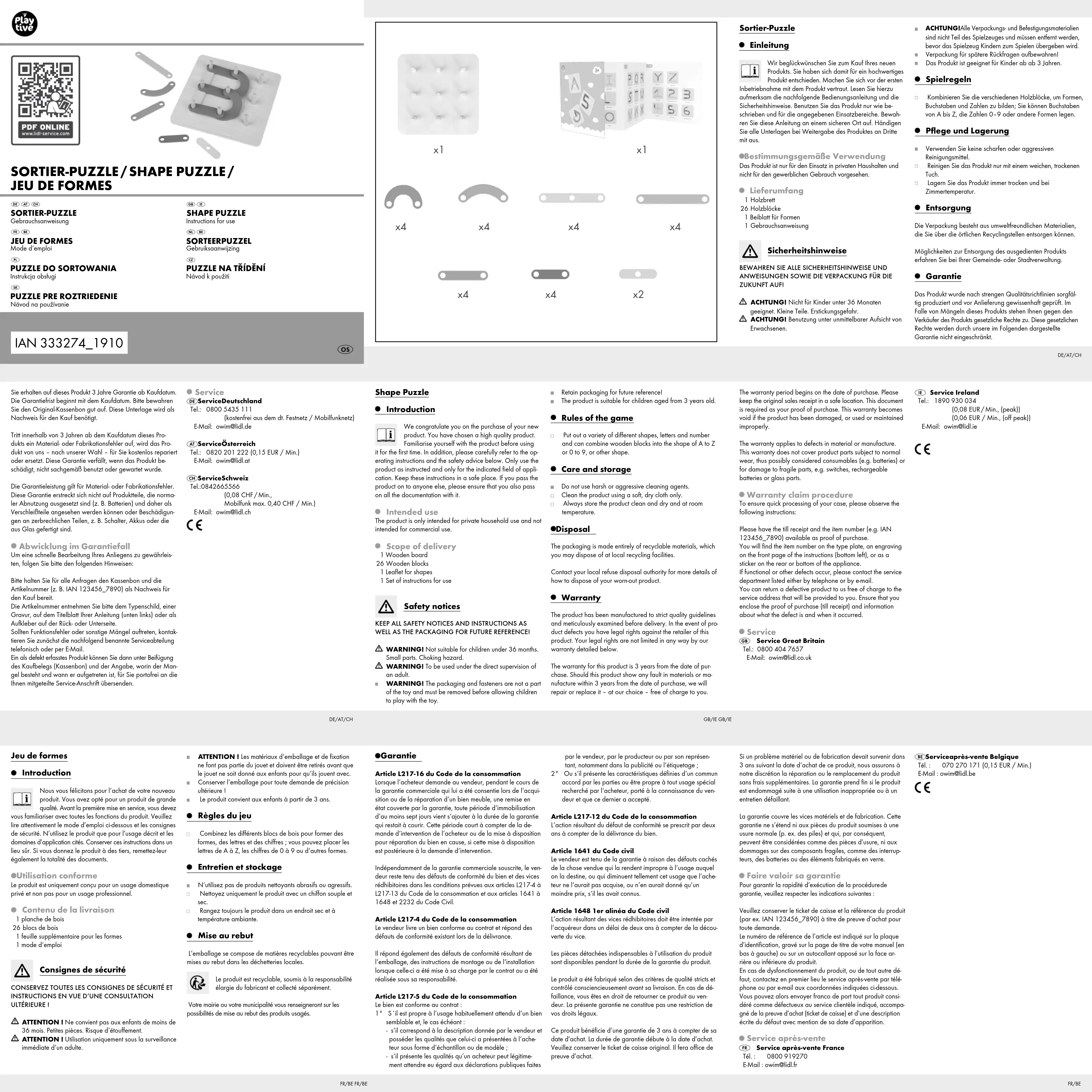 ANWEISUNGEN SOWIE DIE VERPACKUNG FÜR DIE ZUKUNFT AUF! ACHTUNG! Nicht für Kinder unter 36 Monaten geeignet. Kleine Teile. Erstickungsgefahr. ACHTUNG! Benutzung unter unmittelbarer Aufsicht von Erwachsenen. ACHTUNG! Alle Verpackungs- und Befestigungsmaterialien sind nicht Teil des Spielzeuges und müssen entfernt werden, bevor das Spielzeug Kindern zum Spielen übergeben wird. Verpackung für spätere Rückfragen aufbewahren! Das Produkt ist geeignet für Kinder ab ab 3 Jahren. Spielregeln Kombinieren Sie die verschiedenen Holzblöcke, um Formen, Buchstaben und Zahlen zu bilden; Sie können Buchstaben von A bis Z, die Zahlen 0–9 oder andere Formen legen. Pflege und Lagerung Verwenden Sie keine scharfen oder aggressiven Reinigungsmittel. Reinigen Sie das Produkt nur mit einem weichen, trockenen Tuch. Lagern Sie das Produkt immer trocken und bei Zimmertemperatur. Entsorgung Die Verpackung besteht aus umweltfreundlichen Materialien, die Sie über die örtlichen Recyclingstellen entsorgen können. Möglichkeiten zur Entsorgung des ausgedienten Produkts erfahren Sie bei Ihrer Gemeinde- oder Stadtverwaltung. Garantie Das Produkt wurde nach strengen Qualitätsrichtlinien sorgfäl- tig produziert und vor Anlieferung gewissenhaft geprüft. Im Falle von Mängeln dieses Produkts stehen Ihnen gegen den Verkäufer des Produkts gesetzliche Rechte zu. Diese gesetzlichen Rechte werden durch unsere im Folgenden dargestellte Garantie nicht eingeschränkt. Garantie Article L217-16 du Code de la consommation Lorsque l‘acheteur demande au vendeur, pendant le cours de la garantie commerciale qui lui a été consentie lors de l‘acqui- sition ou de la réparation d‘un bien meuble, une remise en état couverte par la garantie, toute période d‘immobilisation d‘au moins sept jours vient s‘ajouter à la durée de la garantie qui restait à courir. Cette période court à compter de la de- mande d‘intervention de l‘acheteur ou de la mise à disposition pour réparation du bien en cause, si cette mise à disposition est postérieure à la demande d‘intervention. Indépendamment de la garantie commerciale souscrite, le ven- deur reste tenu des défauts de conformité du bien et des vices rédhibitoires dans les conditions prévues aux articles L217-4 à L217-13 du Code de la consommation et aux articles 1641 à 1648 et 2232 du Code Civil. Article L217-4 du Code de la consommation Le vendeur livre un bien conforme au contrat et répond des défauts de conformité existant lors de la délivrance. Il répond également des défauts de conformité résultant de l‘emballage, des instructions de montage ou de l‘installation lorsque celle-ci a été mise à sa charge par le contrat ou a été réalisée sous sa responsabilité. Article L217-5 du Code de la consommation Le bien est conforme au contrat : 1° S´il est propre à l‘usage habituellement attendu d‘un bien semblable et, le cas échéant : - s‘il correspond à la description donnée par le vendeur et posséder les qualités que celui-ci a présentées à l‘ache- teur sous forme d‘échantillon ou de modèle ; - s‘il présente les qualités qu‘un acheteur peut légitime- ment attendre eu égard aux déclarations publiques faites par le vendeur, par le producteur ou par son représen- tant, notamment dans la publicité ou l‘étiquetage ; 2° Ou s‘il présente les caractéristiques définies d‘un commun accord par les parties ou être propre à tout usage spécial recherché par l‘acheteur, porté à la connaissance du ven- deur et que ce dernier a accepté. Article L217-12 du Code de la consommation L‘action résultant du défaut de conformité se prescrit par deux ans à compter de la délivrance du bien. Article 1641 du Code civil Le vendeur est tenu de la garantie à raison des défauts cachés de la chose vendue qui la rendent impropre à l‘usage auquel on la destine, ou qui diminuent tellement cet usage que l‘ache- teur ne l‘aurait pas acquise, ou n‘en aurait donné qu‘un moindre prix, s‘il les avait connus. Article 1648 1er alinéa du Code civil L‘action résultant des vices rédhibitoires doit être intentée par l‘acquéreur dans un délai de deux ans à compter de la décou- verte du vice. Les pièces détachées indispensables à l’utilisation du produit sont disponibles pendant la durée de la garantie du produit. Le produit a été fabriqué selon des critères de qualité stricts et contrôlé consciencieusement avant sa livraison. En cas de dé- faillance, vous êtes en droit de retourner ce produit au ven- deur. La présente garantie ne constitue pas une restriction de vos droits légaux. Ce produit bénéficie d‘une garantie de 3 ans à compter de sa date d’achat. La durée de garantie débute à la date d’achat. Veuillez conserver le ticket de caisse original. Il fera office de preuve d’achat. Jeu de formes Introduction Nous vous félicitons pour l‘achat de votre nouveau produit. Vous avez opté pour un produit de grande qualité. Avant la première mise en service, vous devez vous familiariser avec toutes les fonctions du produit. Veuillez lire attentivement le mode d’emploi ci-dessous et les consignes de sécurité. N’utilisez le produit que pour l’usage décrit et les domaines d’application cités. Conserver ces instructions dans un lieu sûr. Si vous donnez le produit à des tiers, remettez-leur également la totalité des documents. Utilisation conforme Le produit est uniquement conçu pour un usage domestique privé et non pas pour un usage professionnel. Contenu de la livraison 1 planche de bois 26 blocs de bois 1 feuille supplémentaire pour les formes 1 mode d‘emploi Consignes de sécurité CONSERVEZ TOUTES LES CONSIGNES DE SÉCURITÉ ET
