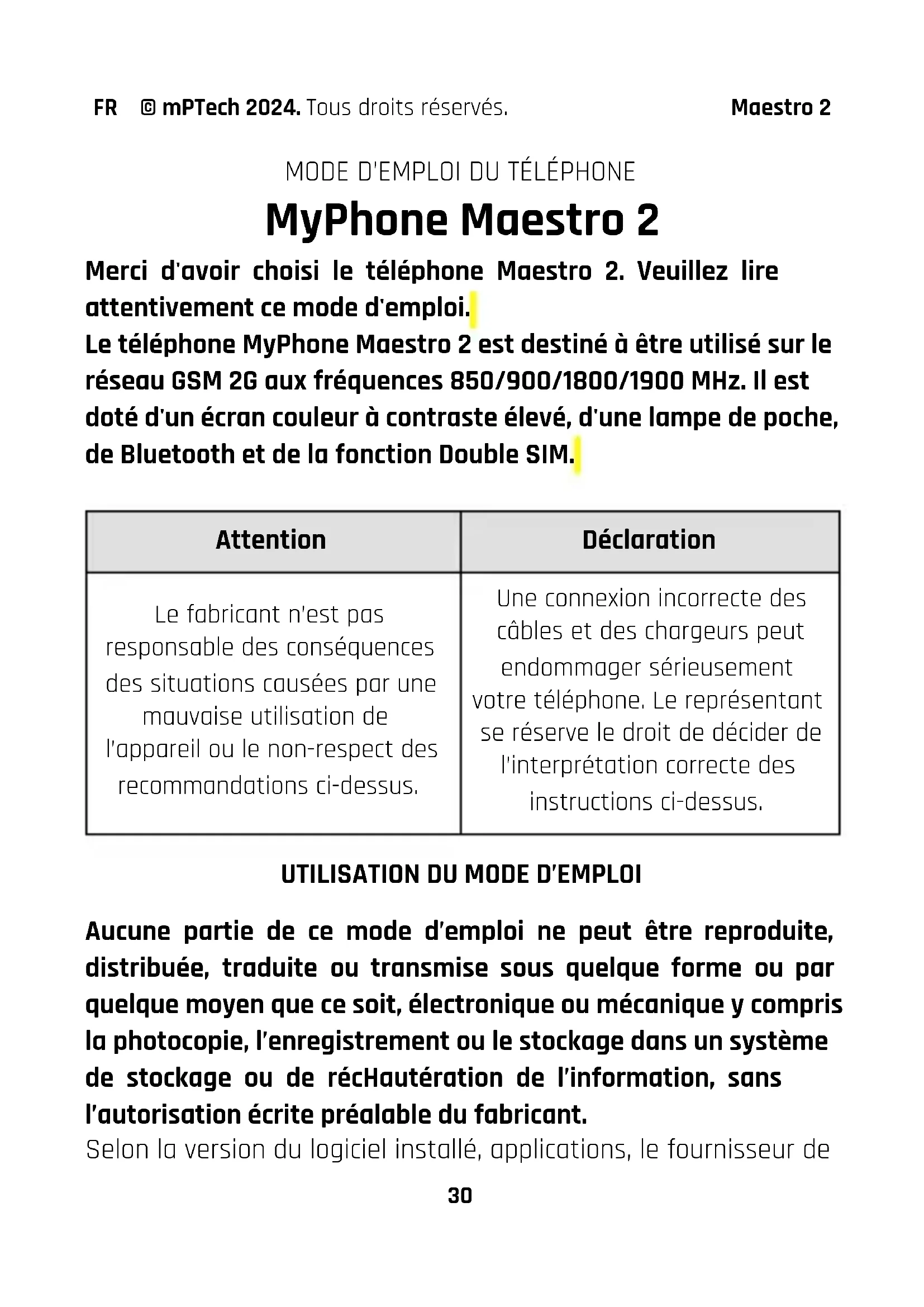 MODE D’EMPLOI DU TÉLÉPHONE MyPhone Maestro 2 Merci d'avoir choisi le téléphone Maestro 2. Veuillez lire attentivement ce mode d'emploi. Le téléphone MyPhone Maestro 2 est destiné à être utilisé sur le réseau GSM 2G aux fréquences 850/900/1800/1900 MHz. Il est doté d'un écran couleur à contraste élevé, d'une lampe de poche, de Bluetooth et de la fonction Double SIM. Attention Déclaration Le fabricant n’est pas responsable des conséquences des situations causées par une mauvaise utilisation de l’appareil ou le non-respect des recommandations ci-dessus. Une connexion incorrecte des câbles et des chargeurs peut endommager sérieusement votre téléphone. Le représentant se réserve le droit de décider de l’interprétation correcte des instructions ci-dessus.