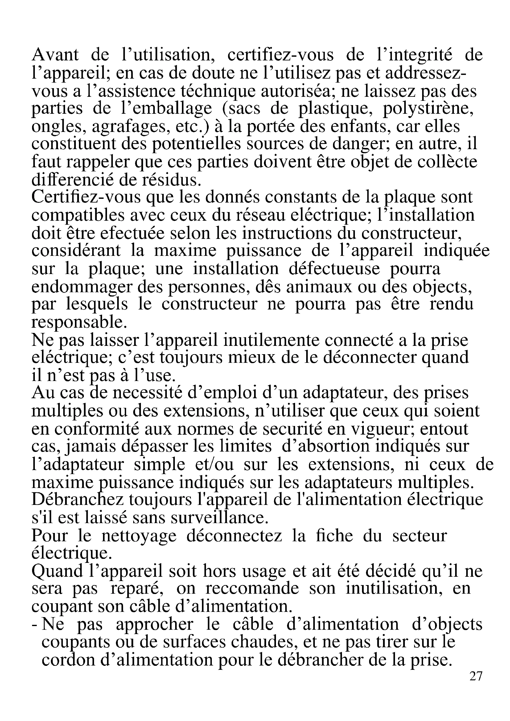 FRANCAIS: ADVERTISSEMENT Les indications suivantes sont très importantes en ce qui concerne l’installation, usage et manutention de cet appareil; gardez soigneusement ce manuel pour des futures consultations; n’utilisez pas l’appareil que selon les indications de ce manuel d’instructions; n’importe quel autre type d’ utilisation devra être consideré inaproprié et potentiellement dangereux; pour cette raison le constructeur ne pourra pas être rendu responsable si des dommages résultants de l’utilisation inapropriée ou irresponsable de l’appareil se produisent.27 Avant de l’utilisation, certifiez-vous de l’integrité de l’appareil; en cas de doute ne l’utilisez pas et addressez- vous a l’assistence téchnique autoriséa; ne laissez pas des parties de l’emballage (sacs de plastique, polystirène, ongles, agrafages, etc.) à la portée des enfants, car elles constituent des potentielles sources de danger; en autre, il faut rappeler que ces parties doivent être objet de collècte differencié de résidus. Certifiez-vous que les donnés constants de la plaque sont compatibles avec ceux du réseau eléctrique; l’installation doit être efectuée selon les instructions du constructeur, considérant la maxime puissance de l’appareil indiquée sur la plaque; une installation défectueuse pourra endommager des personnes, dês animaux ou des objects, par lesquels le constructeur ne pourra pas être rendu responsable. Ne pas laisser l’appareil inutilemente connecté a la prise eléctrique; c’est toujours mieux de le déconnecter quand il n’est pas à l’use. Au cas de necessité d’emploi d’un adaptateur, des prises multiples ou des extensions, n’utiliser que ceux qui soient en conformité aux normes de securité en vigueur; entout cas, jamais dépasser les limites d’absortion indiqués sur l’adaptateur simple et/ou sur les extensions, ni ceux de maxime puissance indiqués sur les adaptateurs multiples. Débranchez toujours l'appareil de l'alimentation électrique s'il est laissé sans surveillance. Pour le nettoyage déconnectez la fiche du secteur électrique. Quand l’appareil soit hors usage et ait été décidé qu’il ne sera pas reparé, on reccomande son inutilisation, en coupant son câble d’alimentation. - Ne pas approcher le câble d’alimentation d’objects coupants ou de surfaces chaudes, et ne pas tirer sur le cordon d’alimentation pour le débrancher de la prise.28 Ne le laissez pas pendre du plan de travail où un enfant pourrait le tenir. - Ne pas utiliser l’appareil si le câble d’alimentation ou la fiche de connéction eléctrique sont endommagés, ou encore en cas de court-circuits; dans ce cas là, apporter l’appareil a un centre d’assistence autorisé. - L’appareil n’est pas indiqué pour être exposé à des conditions météorologiques défavorables (pluie, vent, humidité, la glace, etc.); Gardez-le dans un endroit sec. Jamais opérer ou même toucher l’appareil avec les mains mouillées ou les pieds nus. - Cet appareil peut être utilisé par des enfants agés de plus de 8 ans et par des personnes avec une réduite capacité phisique, sensorial ou mental, ou encore avec peu d’expérience à son usage, pourvu qu’une supervision adéquate leur en soit assuré, ou s’ils auraient été instruits à l’usage de l’appareil en complete securité. Les opérations de nettoyage e de manutention ne oivent pás être efectués par des enfants, sauf pour ceux qui sont agés de plus de 8 ans et sont supervisionés. - Gardez l’appareil et le câble d’alimentation hors la portée des enfants agés de moins de 8 ans. - Les enfants ne doivent pas jouer avec cet appareil. Si le câble d'alimentation est endommagé ou en cas de panne et / ou de dysfonctionnement, ne modifiez pas l'appareil. Toute réparation doit être effectuée par le fabricant ou par son service d'assistance technique ou, en tout cas, par une personne possédant une qualification similaire, afin d'éviter tout risque. Le non-respect de ce qui précède peut compromettre la sécurité de l'appareil et invalider les conditions de la garantie. ATTENTION: Cet appareil comporte une fonction de chauffage. Quelques surfaces, même si non la plaque elle même, pourront atteindre des températures élevées. Étant donné que la sensibilité à la température diffère de29 personne à personne, cet appareil devrà être usé avec PRUDENCE. Placez l’appareil sur des surfaces adéhrentes et préparées pour cet effet, et utilisez les mésures de protection contre la chaleur conseillées. - Cet appareil est destiné à être utilisé dans les ménages et des applications similaires: les cuisines du personnel dans les magasins, bureaux et autres environnements de travail, pour les clients dans les hôtels, motels et autres environnements de type résidentiel, de type lit et petit- déjeuner, hébergement. - L’appareil n’est pas conçu pour être utilisé avec une minuterie extérieure ou un commande à distance. - N’utiliser que des accéssoires e pièces d’origine. Avant chaque utilisation, effectuez le cordon d'alimentation. Ne soumettez pas le produit à des chocs susceptibles de l'endommager. - Tenir l’appareil à l’écart des environnements où il peut y avoir des gaz, vapeurs, des substances inflammables ou explosives.