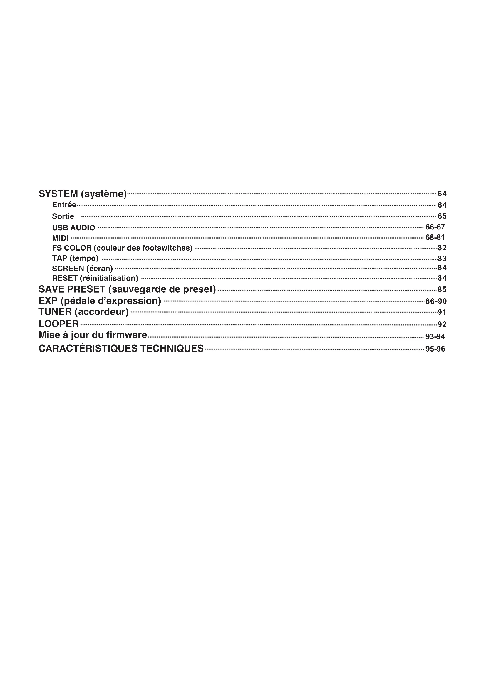 60-6164 SYSTEM (système) Entrée Sortie USB AUDIO MIDI FS COLOR (couleur des footswitches) TAP (tempo) SCREEN (écran) SAVE PRESET (sauvegarde de preset) EXP (pédale d’expression) TUNER (accordeur) LOOPER Mise à jour du firmware RESET (réinitialisation)