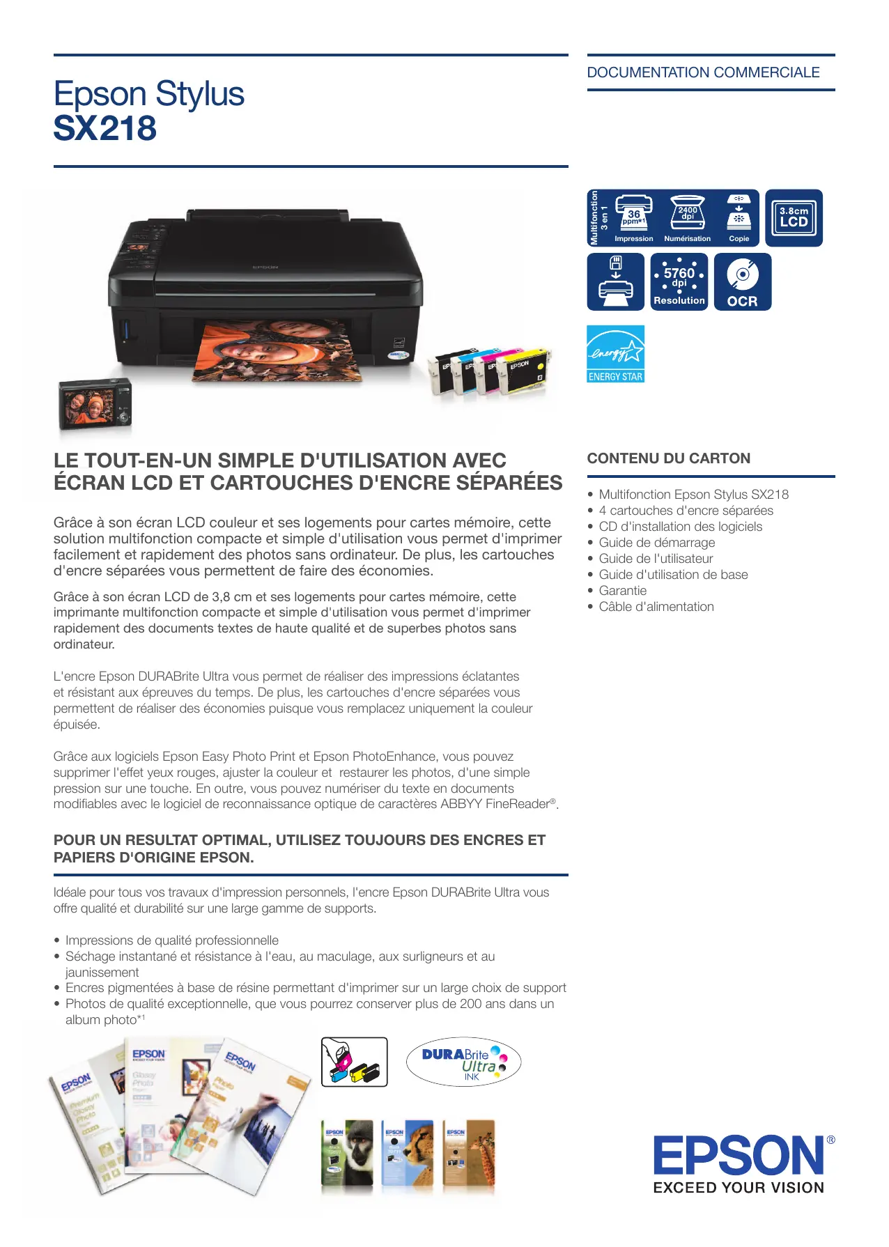 ÉCRAN LCD ET CARTOUCHES D'ENCRE SÉPARÉES Grâce à son écran LCD couleur et ses logements pour cartes mémoire, cette solution multifonction compacte et simple d'utilisation vous permet d'imprimer facilement et rapidement des photos sans ordinateur. De plus, les cartouches d'encre séparées vous permettent de faire des économies. Grâce à son écran LCD de 3,8 cm et ses logements pour cartes mémoire, cette imprimante multifonction compacte et simple d'utilisation vous permet d'imprimer rapidement des documents textes de haute qualité et de superbes photos sans ordinateur. L'encre Epson DURABrite Ultra vous permet de réaliser des impressions éclatantes et résistant aux épreuves du temps. De plus, les cartouches d'encre séparées vous permettent de réaliser des économies puisque vous remplacez uniquement la couleur épuisée. Grâce aux logiciels Epson Easy Photo Print et Epson PhotoEnhance, vous pouvez supprimer l'effet yeux rouges, ajuster la couleur et restaurer les photos, d'une simple pression sur une touche. En outre, vous pouvez numériser du texte en documents modifiables avec le logiciel de reconnaissance optique de caractères ABBYY FineReader®. POUR UN RESULTAT OPTIMAL, UTILISEZ TOUJOURS DES ENCRES ET PAPIERS D'ORIGINE EPSON. Idéale pour tous vos travaux d'impression personnels, l'encre Epson DURABrite Ultra vous offre qualité et durabilité sur une large gamme de supports.
