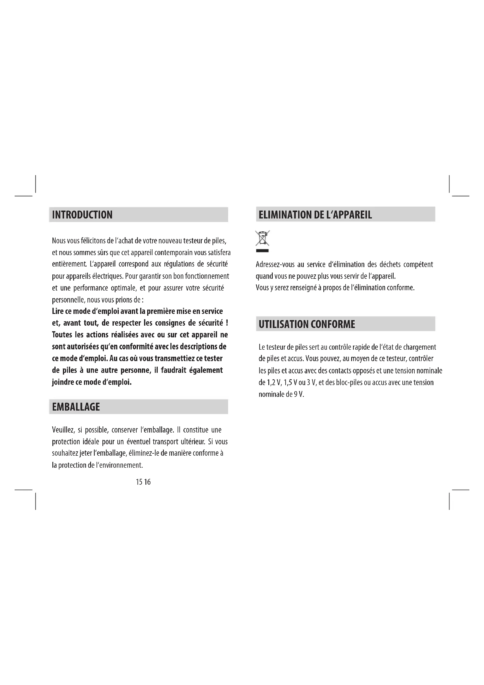 Nous vous félicitons de l‘achat de votre nouveau testeur de piles, et nous sommes sûrs que cet appareil contemporain vous satisfera entièrement. L‘appareil correspond aux régulations de sécurité pour appareils électriques. Pour garantir son bon fonctionnement et une performance optimale, et pour assurer votre sécurité personnelle, nous vous prions de : Lire ce mode d‘emploi avant la première mise en service et, avant tout, de respecter les consignes de sécurité ! Toutes les actions réalisées avec ou sur cet appareil ne sont autorisées qu‘en conformité avec les descriptions de ce mode d‘emploi. Au cas où vous transmettiez ce tester de piles à une autre personne, il faudrait également joindre ce mode d‘emploi. EMBALLAGE Veuillez, si possible, conserver l‘emballage. Il constitue une protection idéale pour un éventuel transport ultérieur. Si vous souhaitez jeter l‘emballage, éliminez-le de manière conforme à la protection de l‘environnement. INTRODUCTION17 18