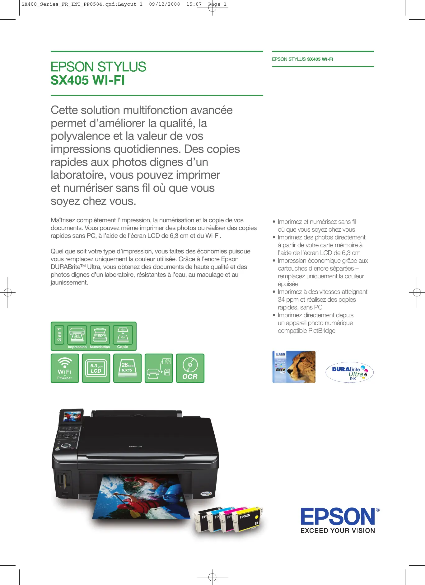 SX400_Series_FR_INT_PP0584.qxd:Layout 1 09/12/2008 15:07 Page 1 Cette solution multifonction avancée permet d’améliorer la qualité, la polyvalence et la valeur de vos impressions quotidiennes. Des copies rapides aux photos dignes d’un laboratoire, vous pouvez imprimer et numériser sans fil où que vous soyez chez vous. Maîtrisez complètement l’impression, la numérisation et la copie de vos documents. Vous pouvez même imprimer des photos ou réaliser des copies rapides sans PC, à l’aide de l’écran LCD de 6,3 cm et du Wi-Fi. 3 en 1 Quel que soit votre type d’impression, vous faites des économies puisque vous remplacez uniquement la couleur utilisée. Grâce à l’encre Epson DURABriteTM Ultra, vous obtenez des documents de haute qualité et des photos dignes d’un laboratoire, résistantes à l’eau, au maculage et au jaunissement.