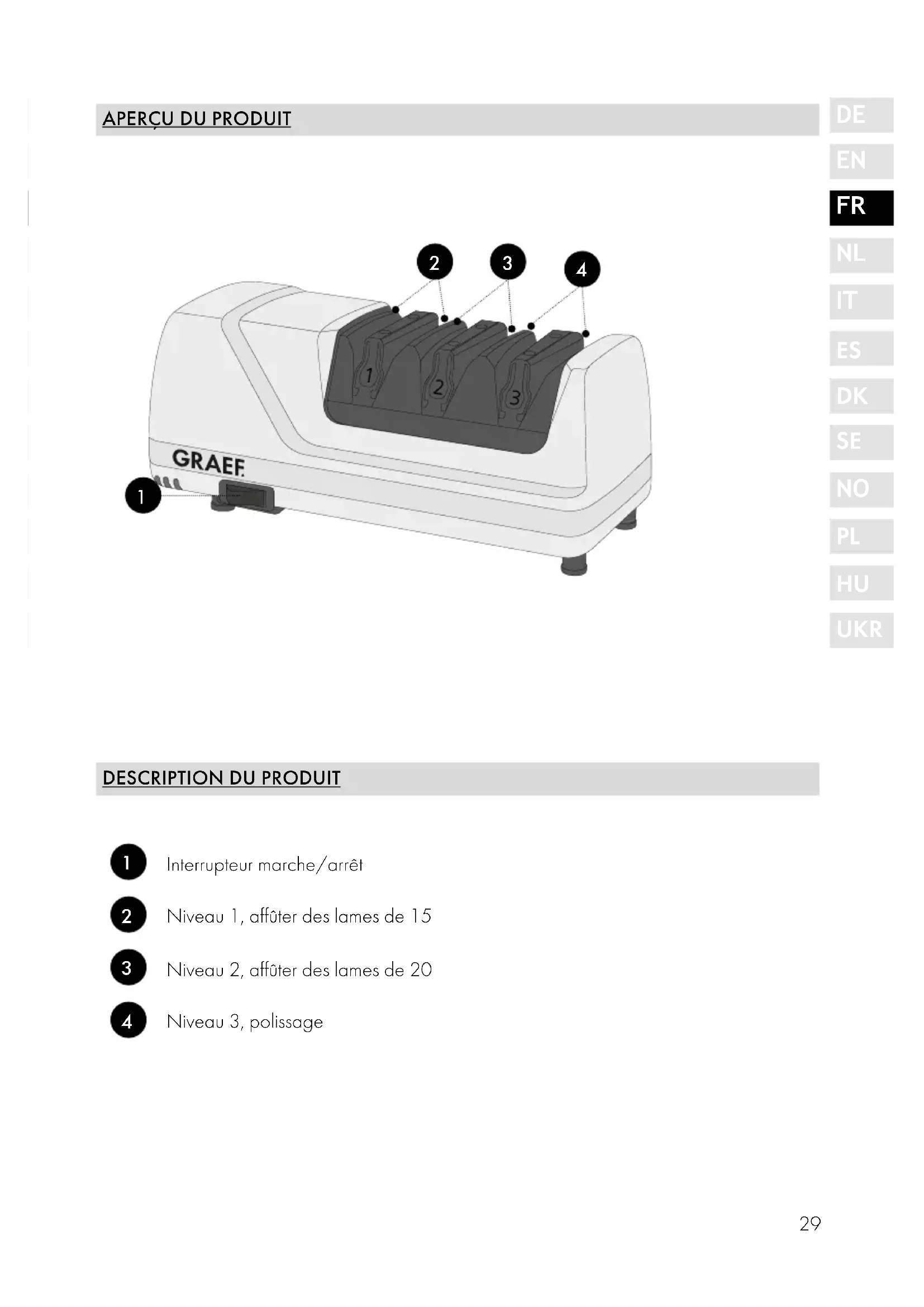 UKR INDICATIONS GÉNÉRALES SUR LA SÉCURITÉ Cet appareil est conforme aux dispositions de sécurité prescrites. Pour une manipulation sûre, veuillez respecter les consignes de sécurité sui- vantes: ● Une utilisation non-conforme peut entraîner des dommages pour les personnes et les objets. ● Avant utilisation, veuillez contrôler l'absence de dommages extérieurs visibles sur le boîtier, le câble et la fiche d'alimentation. ● Ne faites pas fonctionner un appareil endommagé. ● Si le câble de branchement est endommagé, il ne doit être remplacé que par le fabricant, son service après-vente ou une personne de qualification similaire pour éviter tout danger. ● Les réparations ne doivent être effectuées que par un spécialiste ou le service après-vente de Graef. Les réparations non-conformes peuvent entraîner des dangers considérables pour l'utilisateur. En outre, elles annulent tous droits de garantie. ● Les pièces défectueuses ne doivent être remplacées que par des pièces de rechange originales. Seules ces pièces permettent de ga- rantir les exigences en matière de sécurité. ● Cet appareil ne doit pas être utilisé par des enfants. L'appareil et son câble de raccordement doivent être tenus hors de la portée des en- fants. ● Les enfants doivent rester sous surveillance, afin de s'assurer qu'ils ne jouent pas avec l'appareil. ● Cet appareil peut aussi être utilisé par des personnes à capacité phy- siques, sensorielles ou mentales réduites ou ayant un manque d'ex- périence et/ou de savoir, lorsqu'ils sont surveillés ou qu'une utilisation sûre de l'appareil leur a été enseigné et qu'ils ont compris les dangers induits par l'appareil. ● L'appareil n'est pas conçu pour être utilisé avec une minuterie externe ou une télécommande séparée. ● Débrancher le câble d'alimentation en tirant la fiche hors de la prise, sans tirer sur le câble.32 ● Veillez à ce que le câble électrique ne reste accroché nulle part. Cela pourrait entraîner la chute de l'appareil. ● Les matériaux d'emballage ne doivent pas être utilisés pour jouer. Risque d'étouffement. ● Éteignez toujours l'appareil et débranchez-le de l'alimentation élec- trique lorsque vous ne l'utilisez pas ou qu'il est laissé sans surveillance. De la même façon, avant de nettoyer et d'entretenir l'appareil ou lorsque vous remplacez des accessoires. ● Assurez-vous de n'insérer que des lames de couteau propres. ● L'affûteur de couteau sert à l'affûtage de couteaux de cuisine, de canifs et de certains couteaux de loisirs. N'essayez pas d'affûter de lames de ciseaux, de haches, de couteaux céramiques ou d'autres types de lames qui s'insèrent facilement dans la fente d'affûtage. ● PRUDENCE: Les couteaux sont très tranchants après l'affûtage. ● N'utilisez pas d'huile d'affûtage ou d'autres agents lubrifiants.