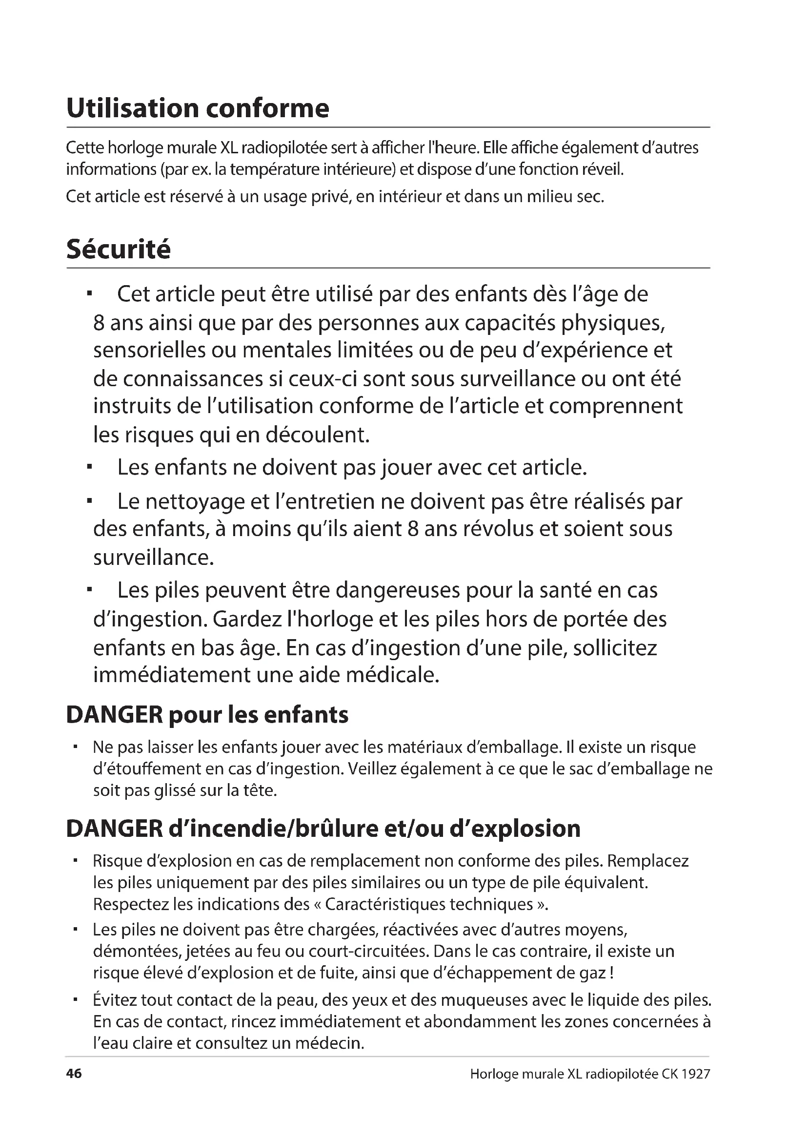 Horloge murale XL radiopilotée CK 1927 Utilisation conforme Cette horloge murale XL radiopilotée sert à afficher l'heure. Elle affiche également d’autres informations (par ex. la température intérieure) et dispose d’une fonction réveil. Cet article est réservé à un usage privé, en intérieur et dans un milieu sec. Sécurité Cet article peut être utilisé par des enfants dès l’âge de 8ans ainsi que par des personnes aux capacités physiques, sensorielles ou mentales limitées ou de peu d’expérience et de connaissances si ceux-ci sont sous surveillance ou ont été instruits de l’utilisation conforme de l’article et comprennent les risques qui en découlent. Les enfants ne doivent pas jouer avec cet article. Le nettoyage et l’entretien ne doivent pas être réalisés par des enfants, à moins qu’ils aient 8ans révolus et soient sous surveillance. Les piles peuvent être dangereuses pour la santé en cas d’ingestion. Gardez l'horloge et les piles hors de portée des enfants en bas âge. En cas d’ingestion d’une pile, sollicitez immédiatement une aide médicale. DANGER pour les enfants Ne pas laisser les enfants jouer avec les matériaux d’emballage. Il existe un risque d’étouement en cas d’ingestion. Veillez également à ce que le sac d’emballage ne soit pas glissé sur la tête. DANGER d’incendie/brûlure et/ou d’explosion Risque d’explosion en cas de remplacement non conforme des piles. Remplacez les piles uniquement par des piles similaires ou un type de pile équivalent. Respectez les indications des «Caractéristiques techniques». Les piles ne doivent pas être chargées, réactivées avec d’autres moyens, démontées, jetées au feu ou court-circuitées. Dans le cas contraire, il existe un risque élevé d’explosion et de fuite, ainsi que d’échappement de gaz! Évitez tout contact de la peau, des yeux et des muqueuses avec le liquide des piles. En cas de contact, rincez immédiatement et abondamment les zones concernées à l’eau claire et consultez un médecin.Caractéristiques techniques