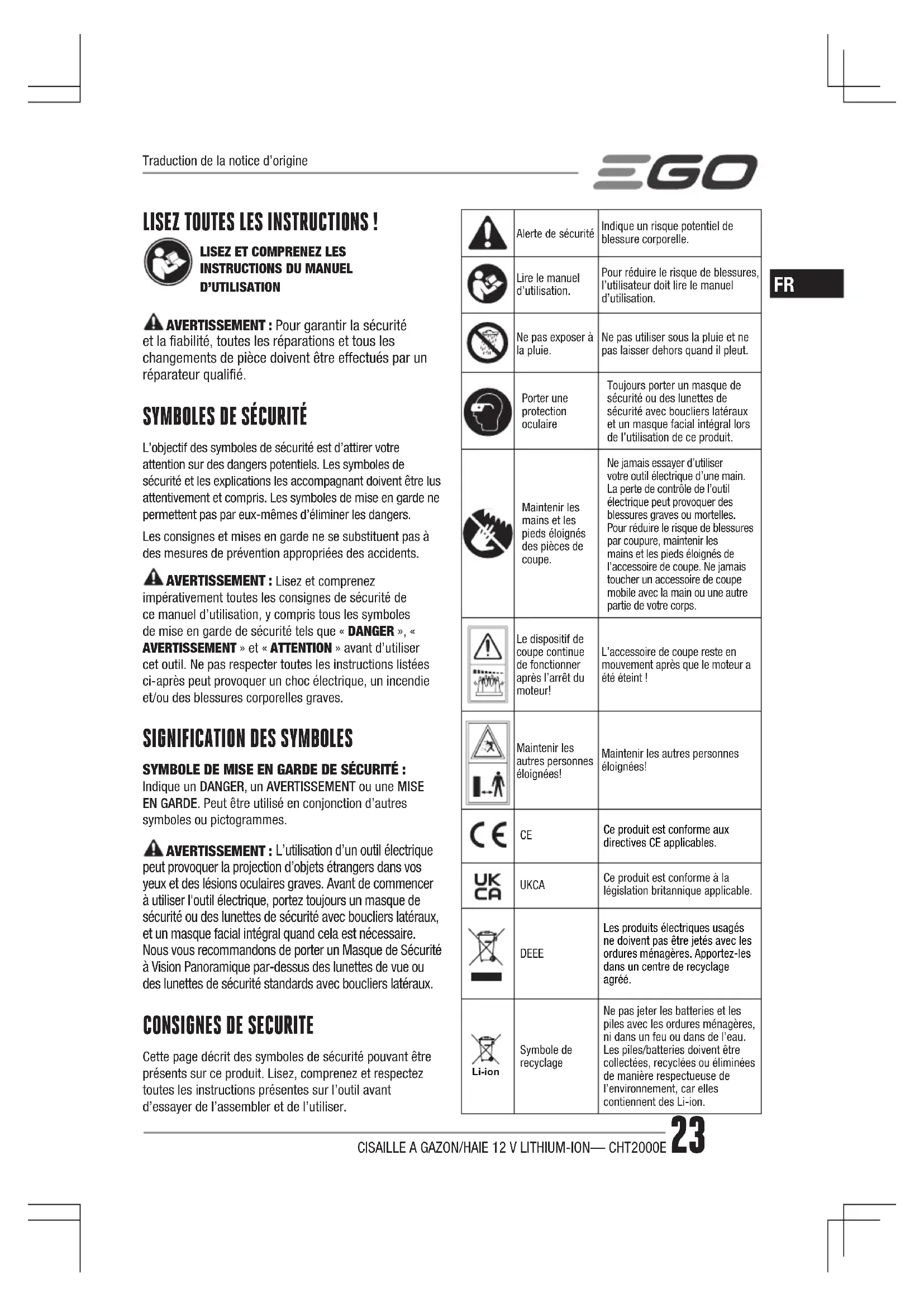 Cette page décrit des symboles de sécurité pouvant être présents sur ce produit. Lisez, comprenez et respectez toutes les instructions présentes sur l’outil avant d’essayer de l’assembler et de l’utiliser. Alerte de sécuritéIndique un risque potentiel de blessure corporelle.Lire le manuel d’utilisation.Pour réduire le risque de blessures, l’utilisateur doit lire le manuel d’utilisation.Ne pas exposer à la pluie.Ne pas utiliser sous la pluie et ne pas laisser dehors quand il pleut.Porter une protection oculaireToujours porter un masque de sécurité ou des lunettes de sécurité avec boucliers latéraux et un masque facial intégral lors de l’utilisation de ce produit.Maintenir les mains et les pieds éloignés des pièces de coupe.Ne jamais essayer d’utiliser votre outil électrique d’une main. La perte de contrôle de l’outil électrique peut provoquer des blessures graves ou mortelles. Pour réduire le risque de blessures par coupure, maintenir les mains et les pieds éloignés de l’accessoire de coupe. Ne jamais toucher un accessoire de coupe mobile avec la main ou une autre partie de votre corps.Le dispositif de coupe continue de fonctionner après l’arrêt du moteur!L’accessoire de coupe reste en mouvement après que le moteur a été éteint !Maintenir les autres personnes éloignées!Maintenir les autres personnes éloignées! Ce produit est conforme aux directives CE applicables.UKCA Ce produit est conforme à la législation britannique applicable. DEEE Les produits électriques usagés ne doivent pas être jetés avec les ordures ménagères. Apportez-les dans un centre de recyclage agréé. Li-ion Symbole de recyclageNe pas jeter les batteries et les piles avec les ordures ménagères, ni dans un feu ou dans de l’eau. Les piles/batteries doivent être collectées, recyclées ou éliminées de manière respectueuse de l’environnement, car elles contiennent des Li-ion. Traduction de la notice d’origineCISAILLE A GAZON/HAIE 12 V LITHIUM-ION— CHT2000E24