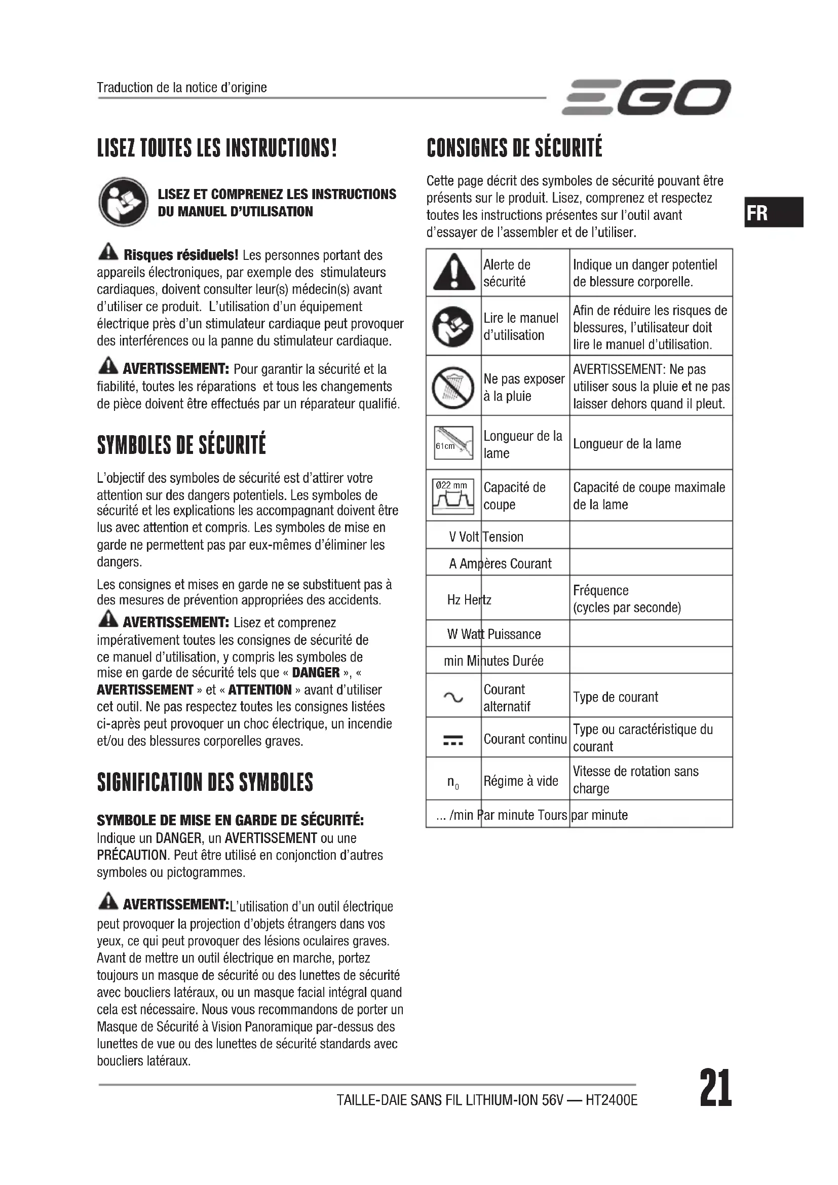 Cette page décrit des symboles de sécurité pouvant être présents sur le produit. Lisez, comprenez et respectez toutes les instructions présentes sur l’outil avant d’essayer de l’assembler et de l’utiliser.Alerte de sécuritéIndique un danger potentiel de blessure corporelle.Lire le manuel d’utilisationAn de réduire les risques de blessures, l’utilisateur doit lire le manuel d’utilisation.Ne pas exposer à la pluieAVERTISSEMENT: Ne pas utiliser sous la pluie et ne pas laisser dehors quand il pleut. 61cm Longueur de la lame Longueur de la lameØ22 mmCapacité de coupeCapacité de coupe maximale de la lameV Volt TensionA Ampères CourantHz HertzFréquence (cycles par seconde)W Watt Puissancemin Minutes DuréeCourant alternatifType de courantCourant continuType ou caractéristique du courant