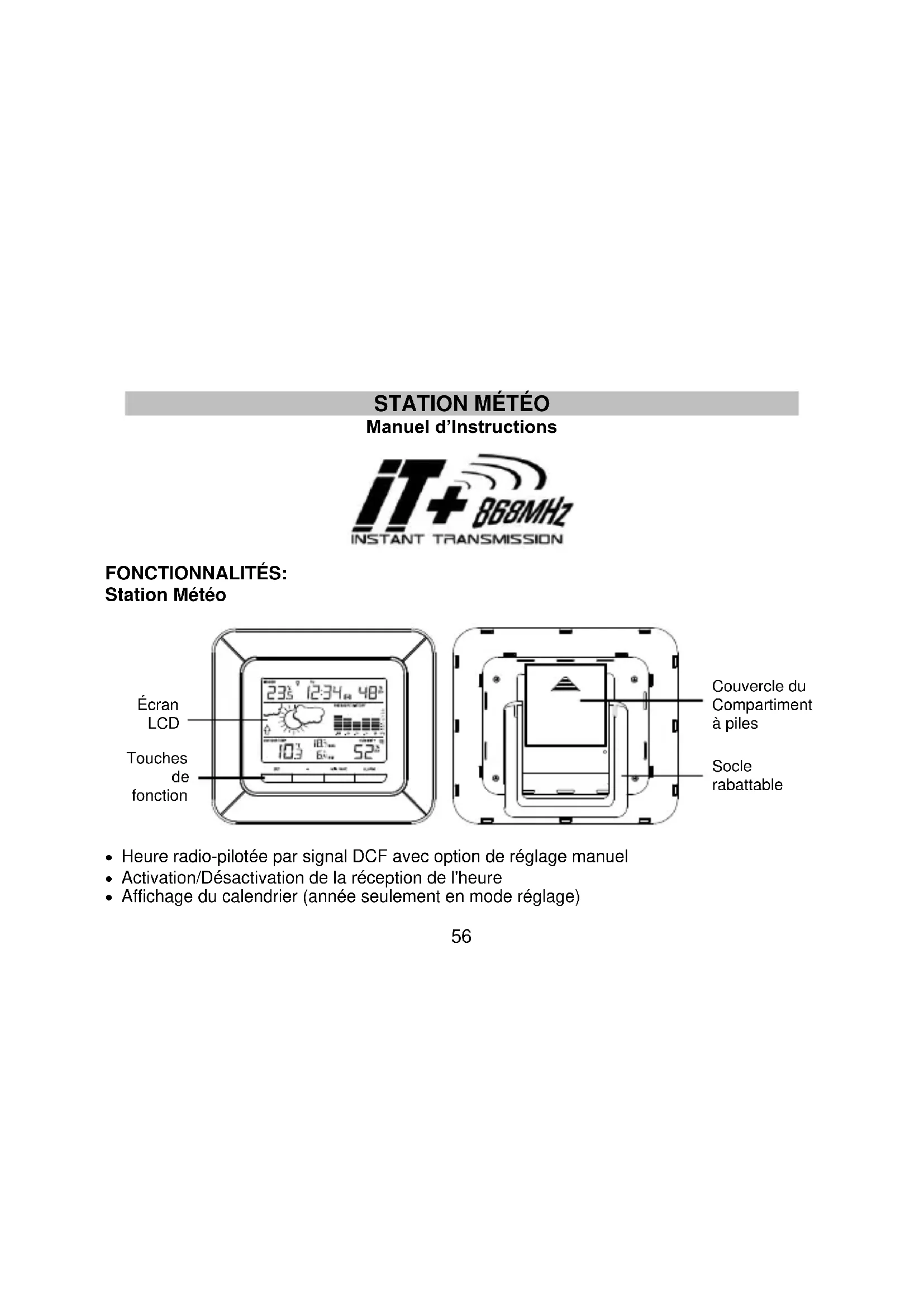 Heure radio-pilotée par signal DCF avec option de réglage manuel Activation/Désactivation de la réception de l'heure Affichage du calendrier (année seulement en mode réglage) Couvercle du Compartiment à piles Socle rabattable57 Réglage du fuseau horaire (de -2h à +5h) Réglage de l ‘heure d’été (DST) Réglage de l’alarme Affichage des températures en °C Affichage de la température ambiante et extérieure avec relevés MIN/MAX Affichage des relevés MIN/MAX de la température extérieure avec enregistrement de l'heure et de la date Tous les relevés MIN/MAX peuvent être réinitialisés Affichage de l'humidité ambiante et extérieure en RH% Prévisions météo avec indicateur de tendance météo Historique de la pression atmosphérique relative sur les 12 dernières heures Réglage du contraste de l'écran LCD Témoin d'usure des piles Socle rabattable L’émetteur thermo-hygromètre Transmission à distance vers la station météo de la température et de l'humidité extérieure par signaux 868MHz Boîtier à fixation murale Installez dans un endroit abrité. Évitez l'exposition directe à la pluie et au soleil58 INSTALLATION ET REMPLACEMENT DES PILES DU TRANSMETTEUR THERMO- HYGROMETRE Le transmetteur thermo-hygro utilise 2 piles AAA, IEC LR3, 1,5V. Pour installer et remplacer les piles, veuillez procéder de la façon suivante: