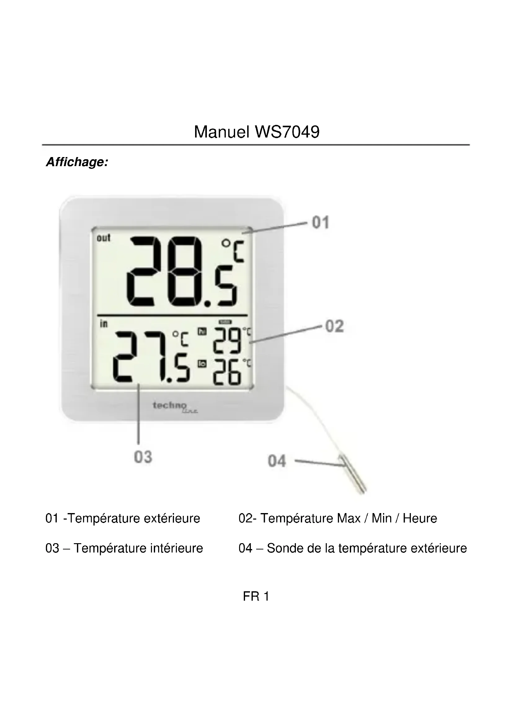 La température intérieure/extérieure s'affiche à l'écran LCD. Appuyez sur la touche « HAUT » pour basculer entre les différents modèles : extérieur au-dessus et intérieur au-dessous / extérieur au-dessous etFR 6 intérieur au-dessus Précautions Ne soumettez pas l’appareil à une force ou à un choc excessif. N’exposez pas l’appareil à la lumière directe du soleil, à des températures extrêmes, à l’humidité ou à la poussière. Ne plongez pas l’appareil dans l’eau. Évitez de le mettre en contact avec des matériaux corrosifs. Ne jetez pas cet appareil au feu, il risque d’exploser. N’ouvrez pas le panneau arrière et n’apportez aucune modification aux composants de cette unité. Avertissements de sécurité concernant les piles Utilisez uniquement des piles alcalines non rechargeables. Installez les piles en respectant les polarités (+/-). Remplacez toujours toutes les piles en même temps. Ne mélangez pas des piles usagées avec des piles neuves.FR 7 Lorsque les piles sont déchargées, les retirer immédiatement de l’appareil. Retirez les piles lorsque vous n’allez pas utiliser l’appareil. N’essayez pas de recharger des piles qui ne sont pas rechargeables et ne jetez aucune pile au feu, elle risque d’exploser. Rangez vos piles de façon à ce qu’aucun objet métallique ne puisse causer de court-circuit. Évitez d’exposer les piles à des températures extrêmes, à l’humidité ou à la lumière directe du soleil. Conservez vos piles hors de la portée des enfants. Elles présentent un risque d’étouffement. N’utilisez cet appareil que pour l’usage auquel il est destiné ! Obligation légale concernant la mise au rebut des piles Ne jetez pas les piles usagées avec les ordures ménagères, car elles sont nuisibles à la santé et à l'environnement. Vous pouvez ramener les pilesFR 8 usagées sans frais à votre revendeur et aux points de collecte. En tant que consommateur, vous êtes obligé par la loi de ramener les piles usagées aux revendeurs et aux points de collecte ! Respect de l’obligation de la loi sur les appareils électriques Ce symbole signifie que les appareils électriques ne doivent pas être jetés aux ordures ménagères à la fin de leur vie utile. Ramenez votre appareil à un point de collecte de déchets ou à un centre de recyclage local. Ceci s’applique à tous les pays de l’Union européenne et aux autres pays européens disposant d’un système de collecte sélectif des déchets.ES 1 Manual de WS7049 Presentación: 01 – Temperatura exterior