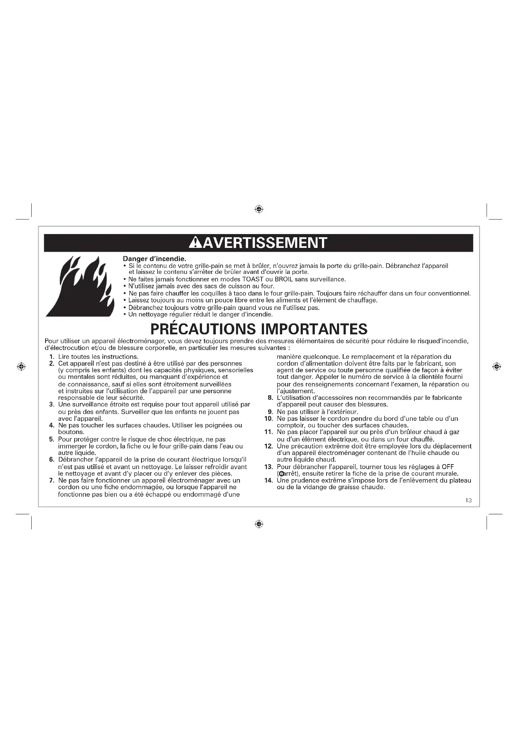 immerger le cordon, la fiche ou le four grille-pain dans l’eau ou autre liquide.