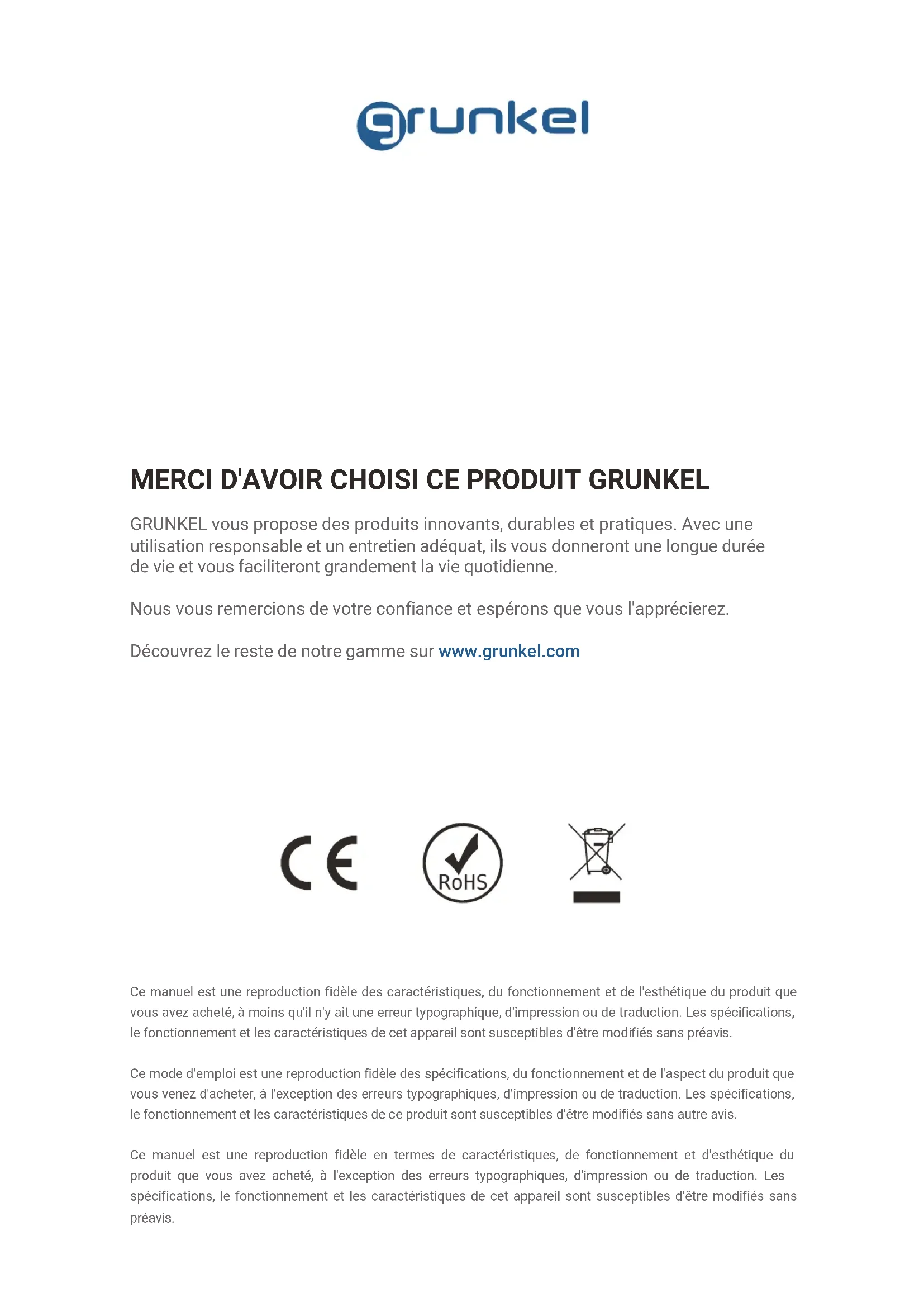 DÉCOUVREZ TOUT CE QUE NOUS POUVONS FAIRE POUR VOUS Àwww.grunkel.comMERCI D'AVOIR CHOISI CE PRODUIT GRUNKEL GRUNKEL vous propose des produits innovants, durables et pratiques. Avec une utilisation responsable et un entretien adéquat, ils vous donneront une longue durée de vie et vous faciliteront grandement la vie quotidienne. Nous vous remercions de votre confiance et espérons que vous l'apprécierez. Découvrez le reste de notre gamme sur www.grunkel.com