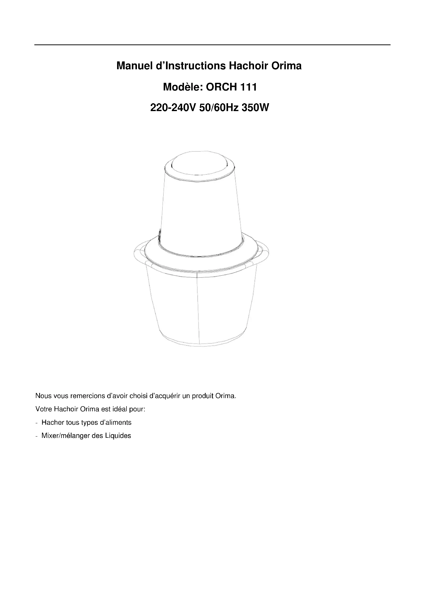 Nous vous remercions d’avoir choisi d’acquérir un produit Orima. Votre Hachoir Orima est idéal pour: - Hacher tous types d’aliments - Mixer/mélanger des Liquides1. Recommandations de Sécurité Lors de l’utilisation d’appareils électriques, des précautions basiques de sécurité doivent toujours être suivies, y compris les suivantes: . Lisez avec attention toutes les instructions avant d’utiliser l’appareil. . Débranchez toujours l’appareil du courant si celui-ci reste sans surveillance et avant de le monter, démonter ou nettoyer. . Cet appareil ne doit pas être utilisé par des enfants. Maintenez l’appareil et le câble hors d’atteinte des enfants. . Les appareils peuvent être utilisés par des personnes ayant des capacités physiques, sensorielles ou mentales réduites ou dénuées d’expérience ou de connaissance, si elles sont correctement surveillés ou si des instructions relatives à l’utilisation de l’appareil en toute sécurité leur ont été données et si les risques encourus ont été appréhendés. . Les enfants ne doivent pas jouer avec l’appareil. . Si le câble d’alimentation est endommagé, celui-ci doit être remplacé par un technicien qualifié, afin d’éviter les risques. . Vous devez faire attention lors de la manipulation des lames de coupe affûtées, lorsque vous videz le bol de verre et durant son nettoyage. . Éteignez l’appareil et débranchez-le de la prise avant de changer des accessoires ou de vous approchez de pièces en mouvement lors de l’utilisation.