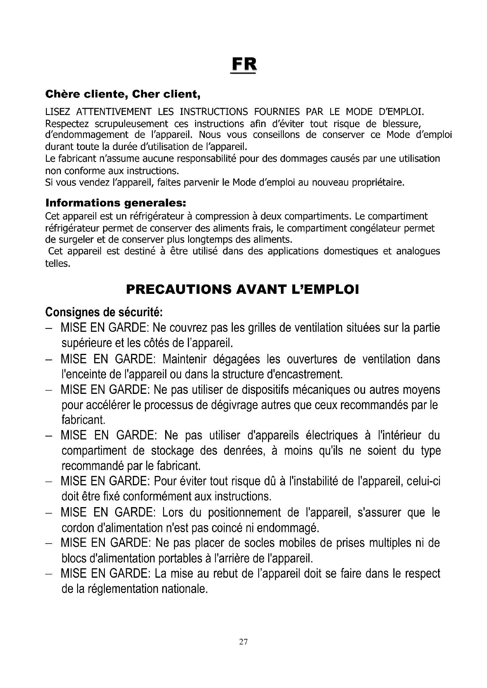 Chère cliente, Cher client, LISEZ ATTENTIVEMENT LES INSTRUCTIONS FOURNIES PAR LE MODE D’EMPLOI. Respectez scrupuleusement ces instructions afin d’éviter tout risque de blessure, d’endommagement de l’appareil. Nous vous conseillons de conserver ce Mode d’emploi durant toute la durée d’utilisation de l’appareil. Le fabricant n’assume aucune responsabilité pour des dommages causés par une utilisation non conforme aux instructions. Si vous vendez l’appareil, faites parvenir le Mode d’emploi au nouveau propriétaire. Informations generales: Cet appareil est un réfrigérateur à compression à deux compartiments. Le compartiment réfrigérateur permet de conserver des aliments frais, le compartiment congélateur permet de surgeler et de conserver plus longtemps des aliments. Cet appareil est destiné à être utilisé dans des applications domestiques et analogues telles.