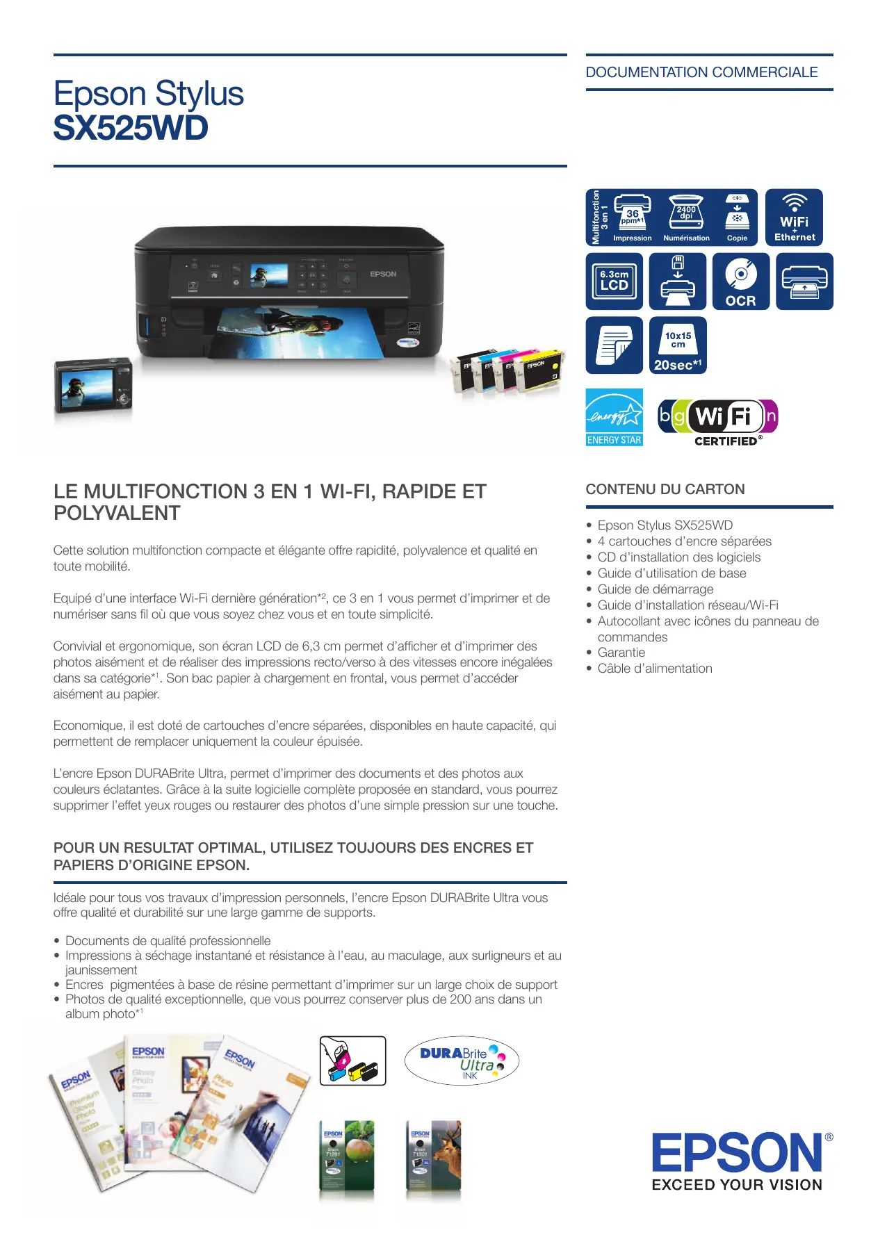 Epson Stylus SX525WD 4 cartouches d’encre séparées CD d’installation des logiciels Guide d’utilisation de base Guide de démarrage Guide d’installation réseau/Wi-Fi Autocollant avec icônes du panneau de commandes