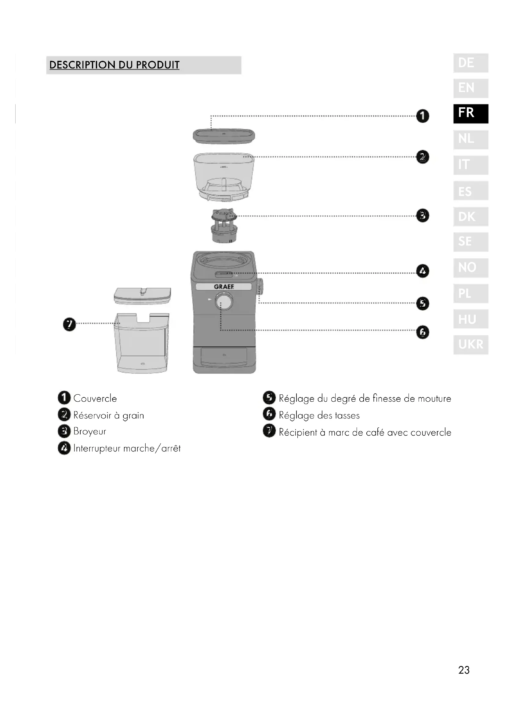 AVANT-PROPOS Chère cliente, cher client, En achetant ce moulin à café, vous avez pris une bonne décision. Vous avez acquis un produit de qualité éprouvé. Nous vous remercions pour votre achat et nous vous souhaitons beaucoup de plaisir avec votre nouveau moulin à café Graef.