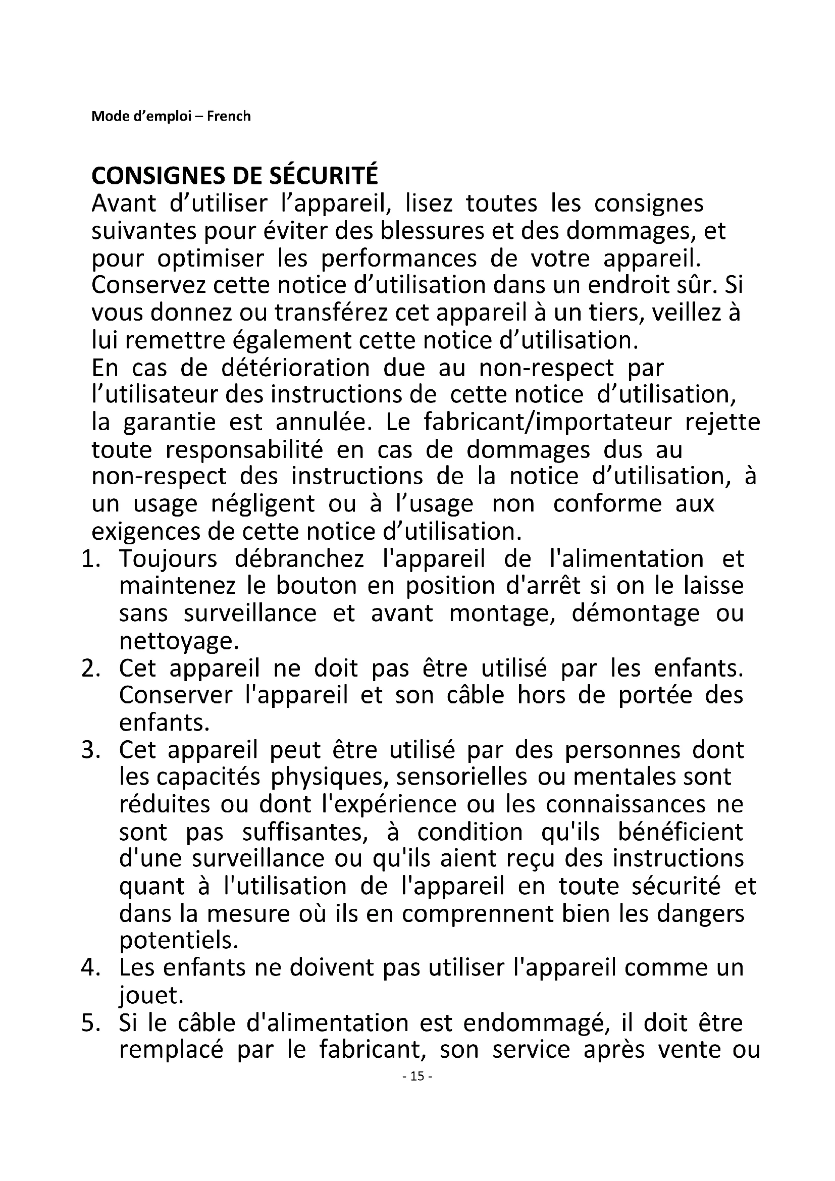 Avant d’utiliser l’appareil, lisez toutes les consignes suivantes pour éviter des blessures et des dommages, et pour optimiser les performances de votre appareil. Conservez cette notice d’utilisation dans un endroit sûr. Si vous donnez ou transférez cet appareil à un tiers, veillez à lui remettre également cette notice d’utilisation. En cas de détérioration due au non-respect par l’utilisateur des instructions de cette notice d’utilisation, la garantie est annulée. Le fabricant/importateur rejette toute responsabilité en cas de dommages dus au non-respect des instructions de la notice d’utilisation, à un usage négligent ou à l’usage non conforme aux exigences de cette notice d’utilisation.