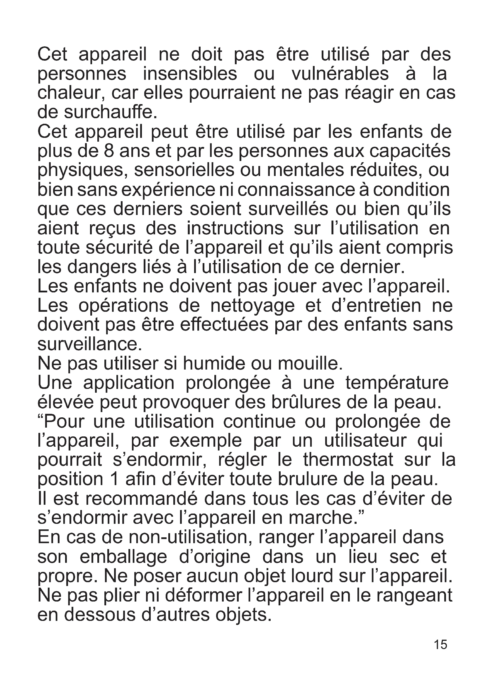 Avvertissements FR15 Cet appareil ne doit pas être utilisé par des personnes insensibles ou vulnérables à la chaleur, car elles pourraient ne pas réagir en cas de surchaue. Cet appareil peut être utilisé par les enfants de plus de 8 ans et par les personnes aux capacités physiques, sensorielles ou mentales réduites, ou bien sans expérience ni connaissance à condition que ces derniers soient surveillés ou bien qu’ils aient reçus des instructions sur l’utilisation en toute sécurité de l’appareil et qu’ils aient compris les dangers liés à l’utilisation de ce dernier. Les enfants ne doivent pas jouer avec l’appareil. Les opérations de nettoyage et d’entretien ne doivent pas être eectuées par des enfants sans surveillance. Ne pas utiliser si humide ou mouille. Une application prolongée à une température élevée peut provoquer des brûlures de la peau. “Pour une utilisation continue ou prolongée de l’appareil, par exemple par un utilisateur qui pourrait s’endormir, régler le thermostat sur la position 1 an d’éviter toute brulure de la peau. Il est recommandé dans tous les cas d’éviter de s’endormir avec l’appareil en marche.” En cas de non-utilisation, ranger l’appareil dans son emballage d’origine dans un lieu sec et propre. Ne poser aucun objet lourd sur l’appareil. Ne pas plier ni déformer l’appareil en le rangeant en dessous d’autres objets.16 Cet appareil n’a pas besoin d’un entretien particulier, il sut d’examiner souvent tous les signes d’usure ou de détérioration de l’appareil, de son câble exible et de I’unité de contrôle. S’il y a tels signes ou si l’appareil a été mal utilisé, il faut le remettre à un centre d’assistance pour le contrôler avant de n’import quel autre usage.” Si le câble d’alimentation devait être endommagé, il faut le remplacer uniquement auprès des centres d’assistance autorisés par le constructeur, an de prévenir chaque risque. Pour le nettoyage de l’appareil, se référer au paragraphe ENTRETIEN. Les femmes enceintes, les diabétiques ou les porteurs de pacemaker doivent consulter un médecin avant d’utiliser cet appareil. Cet appareil a été conçu et produit pour fonctionner comme coussin chauant chaue pieds; tous les autres emplois seront considérés comme abusifs et donc dangereux.