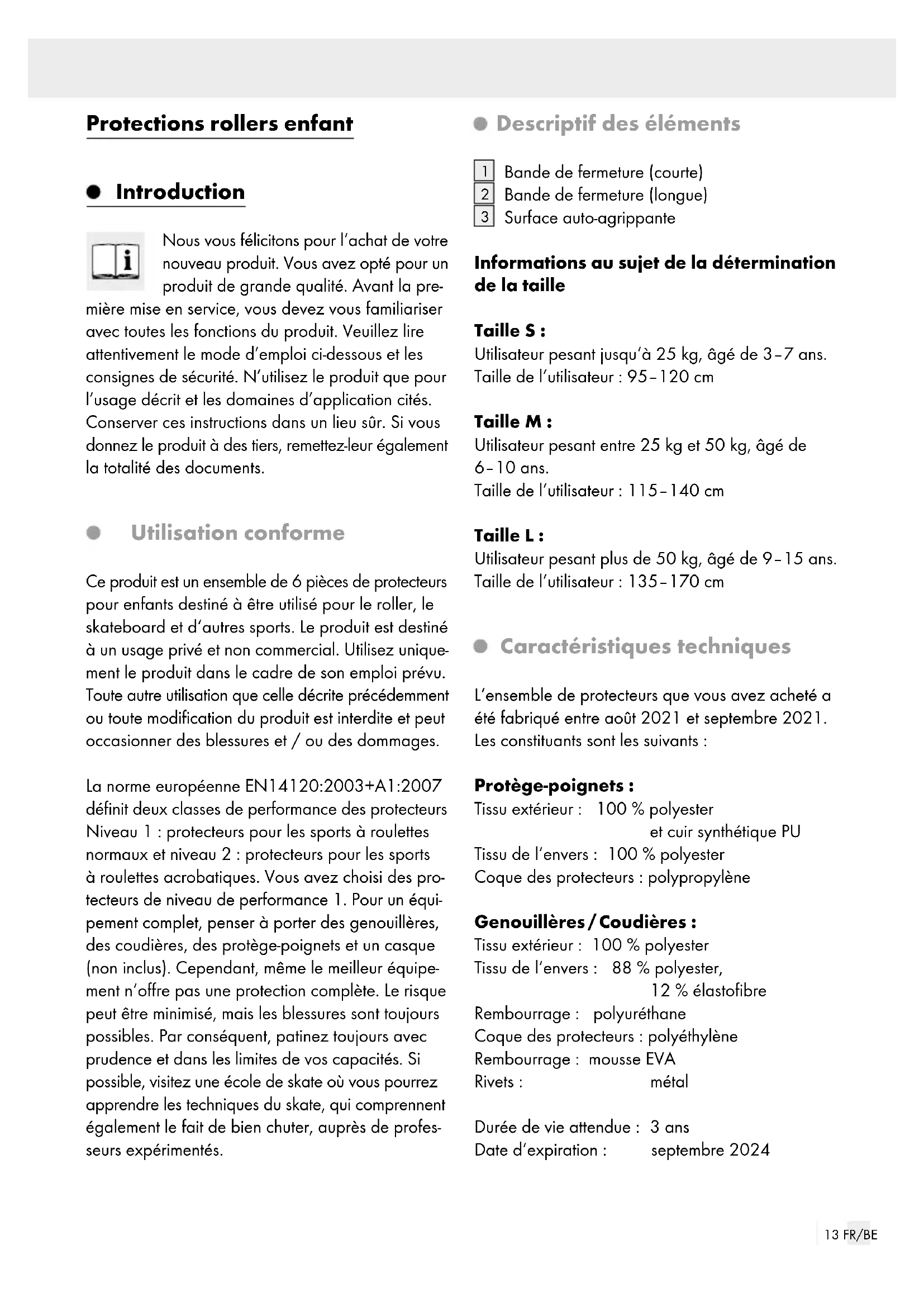 Surface auto-agrippante Informations au sujet de la détermination de la taille Taille S: Utilisateur pesant jusqu‘à 25kg, âgé de 3–7 ans. Taille de l‘utilisateur: 95–120cm Taille M: Utilisateur pesant entre 25kg et 50kg, âgé de 6–10 ans. Taille de l‘utilisateur: 115–140cm Taille L: Utilisateur pesant plus de 50kg, âgé de 9–15 ans. Taille de l‘utilisateur: 135–170cm Caractéristiques techniques L‘ensemble de protecteurs que vous avez acheté a été fabriqué entre août 2021 et septembre 2021. Les constituants sont les suivants: Protège-poignets: Tissu extérieur: 100% polyester et cuir synthétique PU Tissu de l‘envers: 100% polyester Coque des protecteurs: polypropylène Genouillères / Coudières: Tissu extérieur: 100% polyester Tissu de l‘envers: 88% polyester, 12% élastofibre Rembourrage: polyuréthane Coque des protecteurs: polyéthylène Rembourrage: mousse EVA Rivets: métal Durée de vie attendue: 3 ans Date d‘expiration: septembre 202414 FR/BE Contrôlé par TÜV Rheinland LGA Products GmbH Tillystr 2, 90431 Nürnberg, ALLEMAGNE Organisme notifié n° 0197 La déclaration de conformité est disponible sur www.owim.de. Contenu de la livraison Immédiatement après le déballage, veuillez contrô- ler la présence de tous les éléments livrés et que le produit se trouve en parfait état. 2 protège-poignets 2 coudières 2 genouillères 1 mode d’emploi Consignes de sécurité