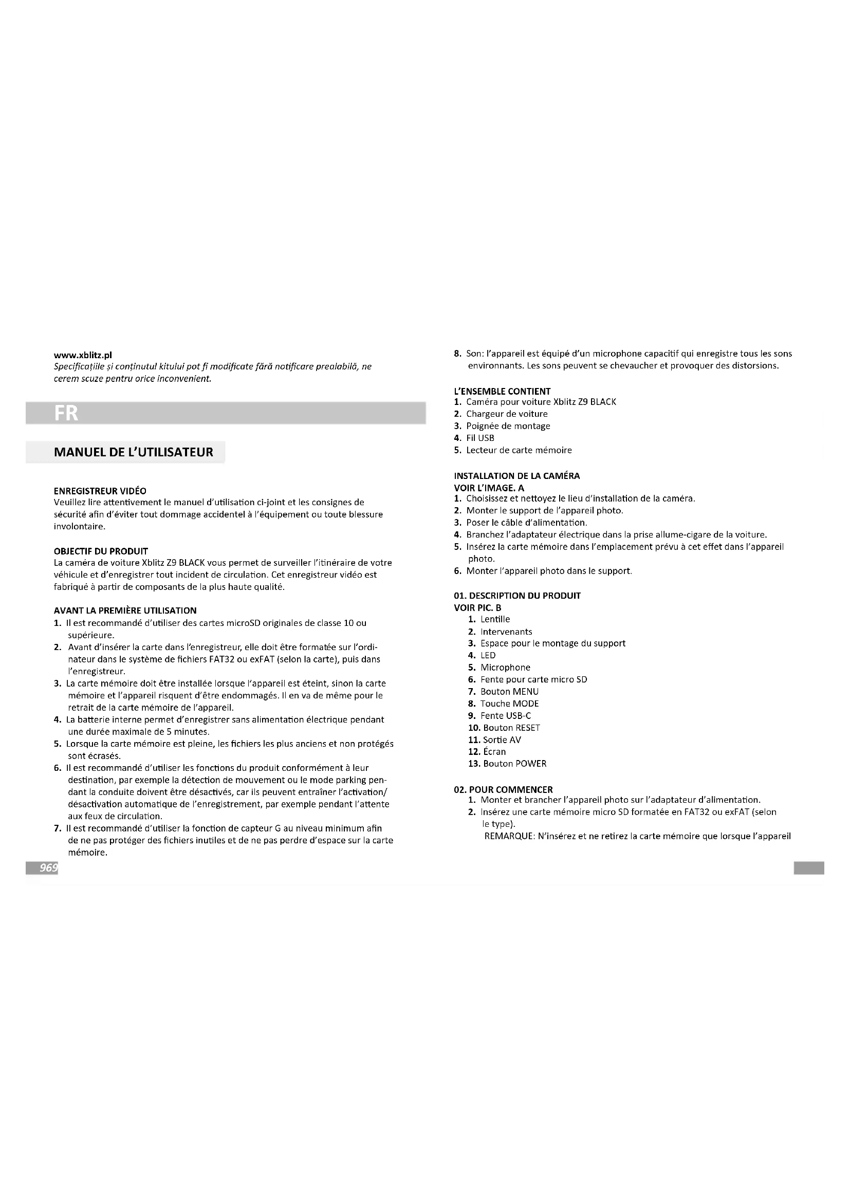 Z9 - Dashcam Xblitz - Notice d'utilisation et mode d'emploi gratuit
