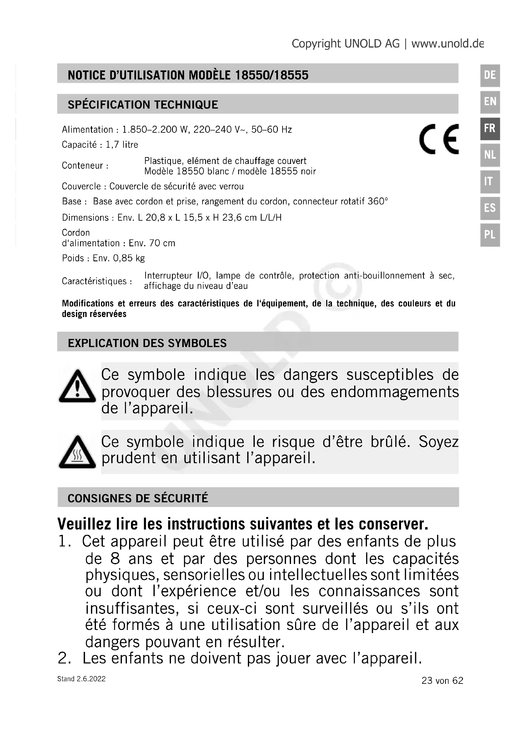 Ce symbole indique les dangers susceptibles de provoquer des blessures ou des endommagements de l’appareil. Ce symbole indique le risque d’être brûlé. Soyez prudent en utilisant l’appareil. Alimentation : 1.850–2.200 W, 220–240 V~, 50–60 Hz Capacité : 1,7 litre Conteneur : Plastique, elément de chauffage couvert Modèle 18550 blanc / modèle 18555 noir Couvercle : Couvercle de sécurité avec verrou Base : Base avec cordon et prise, rangement du cordon, connecteur rotatif 360° Dimensions : Env. L 20,8 x L 15,5 x H 23,6 cm L/L/H Cordon d‘alimentation : Env. 70 cm Poids : Env. 0,85 kg Caractéristiques : Interrupteur I/O, lampe de contrôle, protection anti-bouillonnement à sec, affichage du niveau d’eau Modifications et erreurs des caractéristiques de l‘équipement, de la technique, des couleurs et du design réservées Copyright UNOLD AG | www.unold.de UNOLD ©24 von 62 Stand 2.6.2022