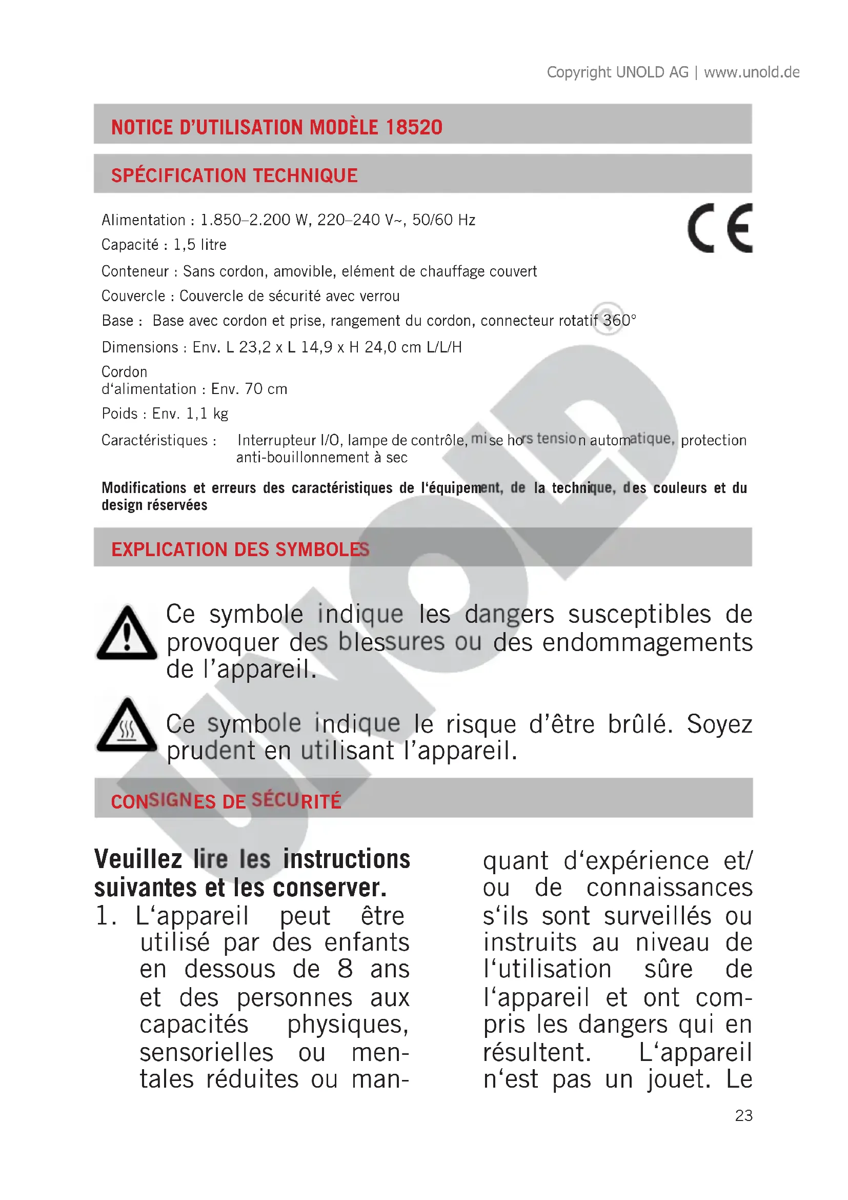 Ce symbole indique les dangers susceptibles de provoquer des blessures ou des endommagements de l’appareil. Ce symbole indique le risque d’être brûlé. Soyez prudent en utilisant l’appareil. Alimentation : 1.850–2.200 W, 220–240 V~, 50/60 Hz Capacité : 1,5 litre Conteneur : Sans cordon, amovible, elément de chauffage couvert Couvercle : Couvercle de sécurité avec verrou Base : Base avec cordon et prise, rangement du cordon, connecteur rotatif 360° Dimensions : Env. L 23,2 x L 14,9 x H 24,0 cm L/L/H Cordon d‘alimentation : Env. 70 cm Poids : Env. 1,1 kg Caractéristiques : Interrupteur I/O, lampe de contrôle, mise hors tension automatique, protection anti-bouillonnement à sec Modifications et erreurs des caractéristiques de l‘équipement, de la technique, des couleurs et du design réservées Copyright UNOLD AG | www.unold.de24 nettoyage et l‘entretien de l‘appareil peuvent être réalisés par des enfants uniquement sous surveillance.