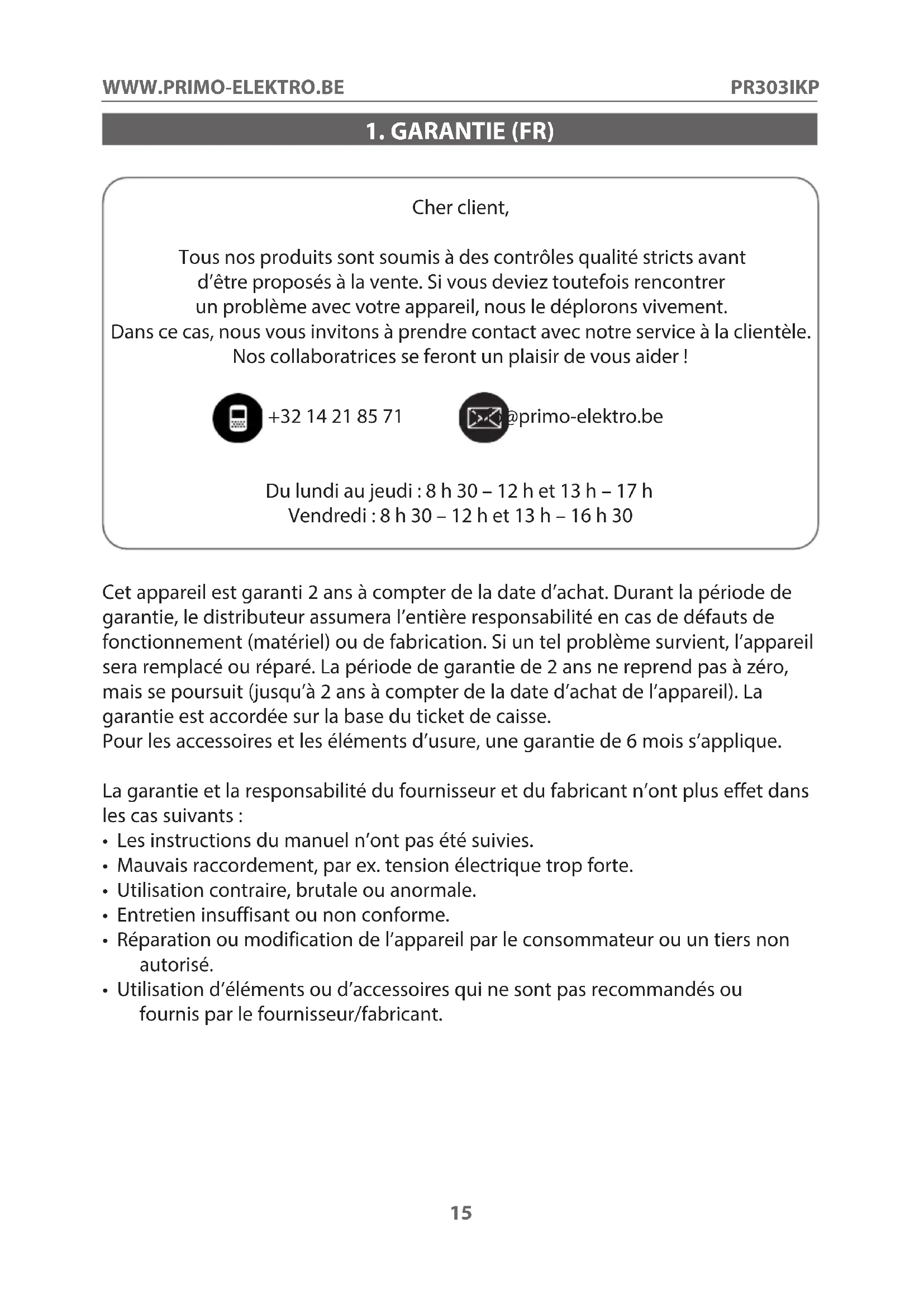 Cher client, Tous nos produits sont soumis à des contrôles qualité stricts avant d’être proposés à la vente. Si vous deviez toutefois rencontrer un problème avec votre appareil, nous le déplorons vivement. Dans ce cas, nous vous invitons à prendre contact avec notre service à la clientèle. Nos collaboratrices se feront un plaisir de vous aider ! +32 14 21 85 71 info@primo-elektro.be Du lundi au jeudi : 8 h 30 – 12 h et 13 h – 17 h Vendredi : 8 h 30 – 12 h et 13 h – 16 h 30 Cet appareil est garanti 2 ans à compter de la date d’achat. Durant la période de garantie, le distributeur assumera l’entière responsabilité en cas de défauts de fonctionnement (matériel) ou de fabrication. Si un tel problème survient, l’appareil sera remplacé ou réparé. La période de garantie de 2 ans ne reprend pas à zéro, mais se poursuit (jusqu’à 2 ans à compter de la date d’achat de l’appareil). La garantie est accordée sur la base du ticket de caisse. Pour les accessoires et les éléments d’usure, une garantie de 6 mois s’applique. La garantie et la responsabilité du fournisseur et du fabricant n’ont plus effet dans les cas suivants :