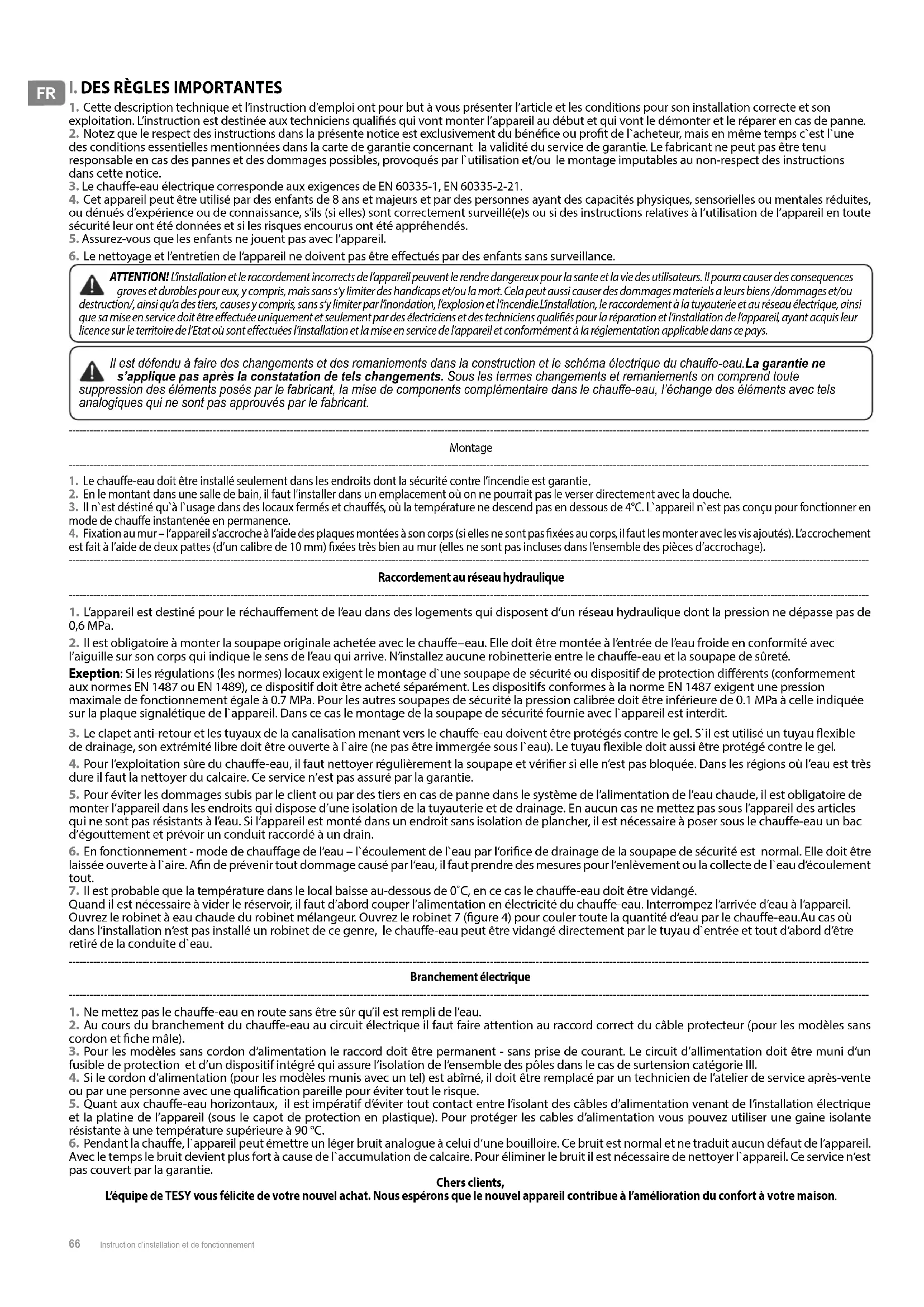 2. Au cours du branchement du chaue-eau au circuit électrique il faut faire attention au raccord correct du câble protecteur (pour les modèles sans cordon et che mâle). 3. Pour les modèles sans cordon d‘alimentation le raccord doit être permanent - sans prise de courant. Le circuit d’allimentation doit être muni d‘un fusible de protection et d’un dispositif intégré qui assure l‘isolation de l‘ensemble des pôles dans le cas de surtension catégorie III. 4. Si le cordon d’alimentation (pour les modèles munis avec un tel) est abîmé, il doit être remplacé par un technicien de l’atelier de service après-vente ou par une personne avec une qualication pareille pour éviter tout le risque. 5. Quant aux chaue-eau horizontaux, il est impératif d’éviter tout contact entre l’isolant des câbles d’alimentation venant de l’installation électrique et la platine de l’appareil (sous le capot de protection en plastique). Pour protéger les cables d’alimentation vous pouvez utiliser une gaine isolante résistante à une température supérieure à 90 °C. 6. Pendant la chaue, l`appareil peut émettre un léger bruit analogue à celui d’une bouilloire. Ce bruit est normal et ne traduit aucun défaut de l’appareil. Avec le temps le bruit devient plus fort à cause de l`accumulation de calcaire. Pour éliminer le bruit il est nécessaire de nettoyer l`appareil. Ce service n‘est pas couvert par la garantie. Chers clients, L’équipe de TESY vous félicite de votre nouvel achat. Nous espérons que le nouvel appareil contribue à l’amélioration du confort à votre maison.Français Instruction d’installation et de fonctionnement 67