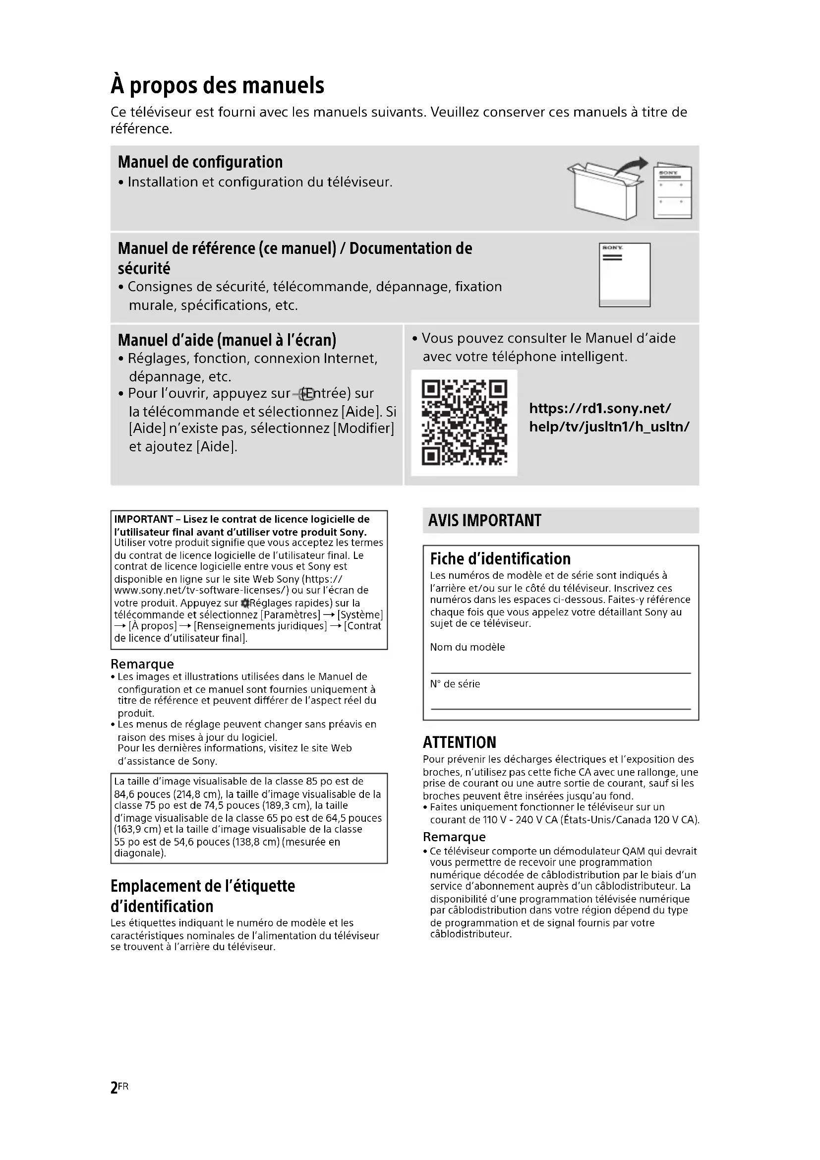 - Vous pouvez consulter le Manuel d’aide avec votre téléphone intelligent. https://rd1.sony.net/ help/tv/jusltn1/h_usltn/ IMPORTANT – Lisez le contrat de licence logicielle de l’utilisateur final avant d’utiliser votre produit Sony. Utiliser votre produit signifie que vous acceptez les termes du contrat de licence logicielle de l’utilisateur final. Le contrat de licence logicielle entre vous et Sony est disponible en ligne sur le site Web Sony (https:// www.sony.net/tv-software-licenses/) ou sur l’écran de votre produit. Appuyez sur (Réglages rapides) sur la télécommande et sélectionnez [Paramètres] [Système] [À propos] [Renseignements juridiques] [Contrat de licence d’utilisateur final]. La taille d’image visualisable de la classe 85 po est de 84,6 pouces (214,8 cm), la taille d’image visualisable de la classe 75 po est de 74,5 pouces (189,3 cm), la taille d’image visualisable de la classe 65 po est de 64,5 pouces (163,9 cm) et la taille d’image visualisable de la classe 55 po est de 54,6 pouces (138,8 cm) (mesurée en diagonale). AVIS IMPORTANT Fiche d’identification Les numéros de modèle et de série sont indiqués à l’arrière et/ou sur le côté du téléviseur. Inscrivez ces numéros dans les espaces ci-dessous. Faites-y référence chaque fois que vous appelez votre détaillant Sony au sujet de ce téléviseur. Nom du modèle N° de série3