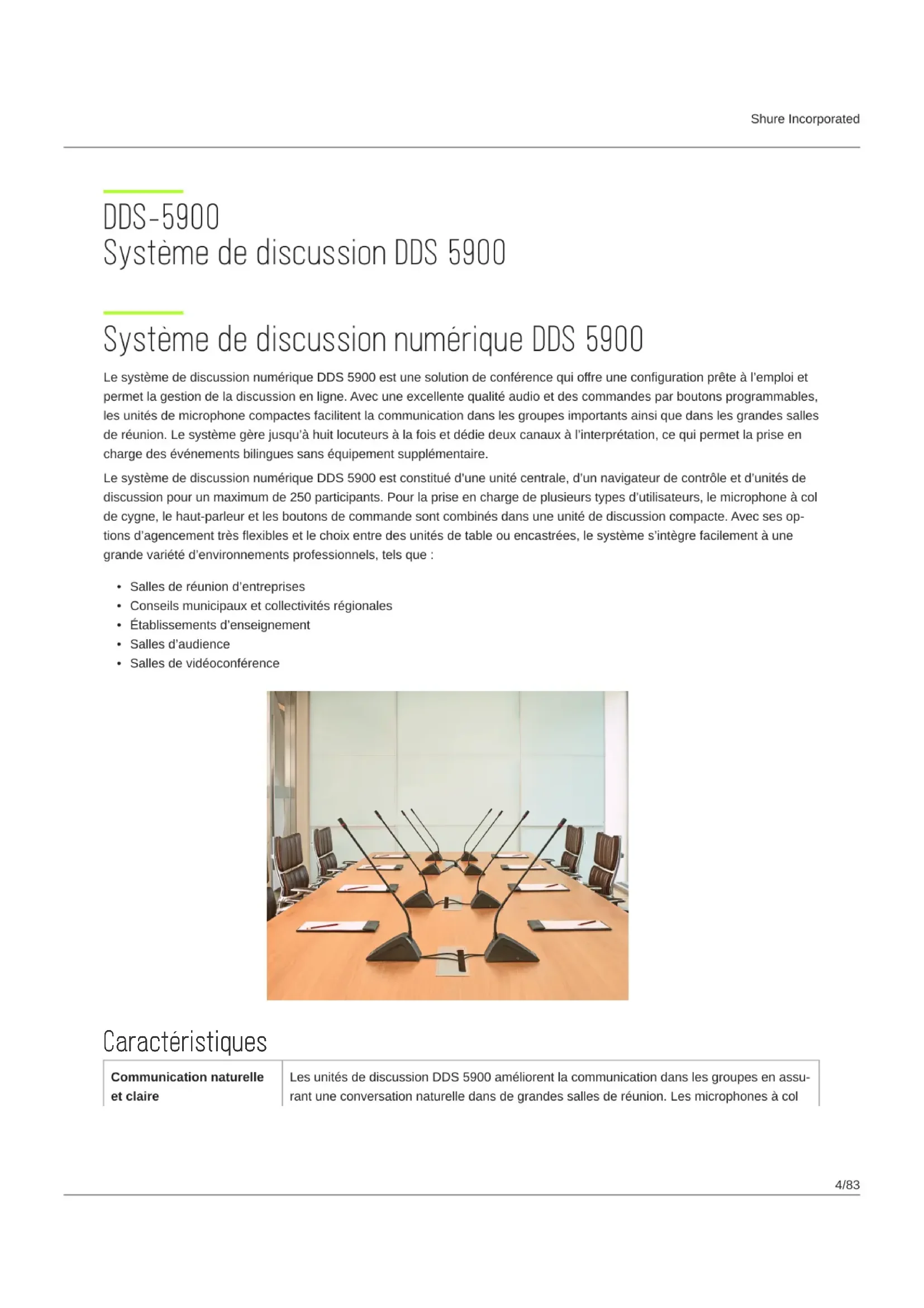 DDS-5900 Système de discussion DDS5900 Système de discussion numérique DDS5900 LesystèmedediscussionnumériqueDDS5900estunesolutiondeconférencequioffreuneconfigurationprêteàl’emploiet permet la gestion de la discussion en ligne. Avec une excellente qualité audio et des commandes par boutons programmables, les unités de microphone compactes facilitent la communication dans les groupes importants ainsi que dans les grandes salles deréunion.Lesystèmegèrejusqu’àhuitlocuteursàlafoisetdédiedeuxcanauxàl’interprétation,cequipermetlapriseen charge des événements bilingues sans équipement supplémentaire. LesystèmedediscussionnumériqueDDS5900estconstituéd’uneunitécentrale,d’unnavigateurdecontrôleetd’unitésde discussionpourunmaximumde250participants.Pourlapriseenchargedeplusieurstypesd’utilisateurs,lemicrophoneàcol decygne,lehaut-parleuretlesboutonsdecommandesontcombinésdansuneunitédediscussioncompacte.Avecsesop- tionsd’agencementtrèsflexiblesetlechoixentredesunitésdetableouencastrées,lesystèmes’intègrefacilementàune grandevariétéd’environnementsprofessionnels,telsque: Sallesderéuniond’entreprises Conseils municipaux et collectivités régionales Établissementsd’enseignement Sallesd’audience Salles de vidéoconférence Caractéristiques Communication naturelle et claire LesunitésdediscussionDDS5900améliorentlacommunicationdanslesgroupesenassu- rant une conversation naturelle dans de grandes salles de réunion. Les microphones à colShure Incorporated 5/83