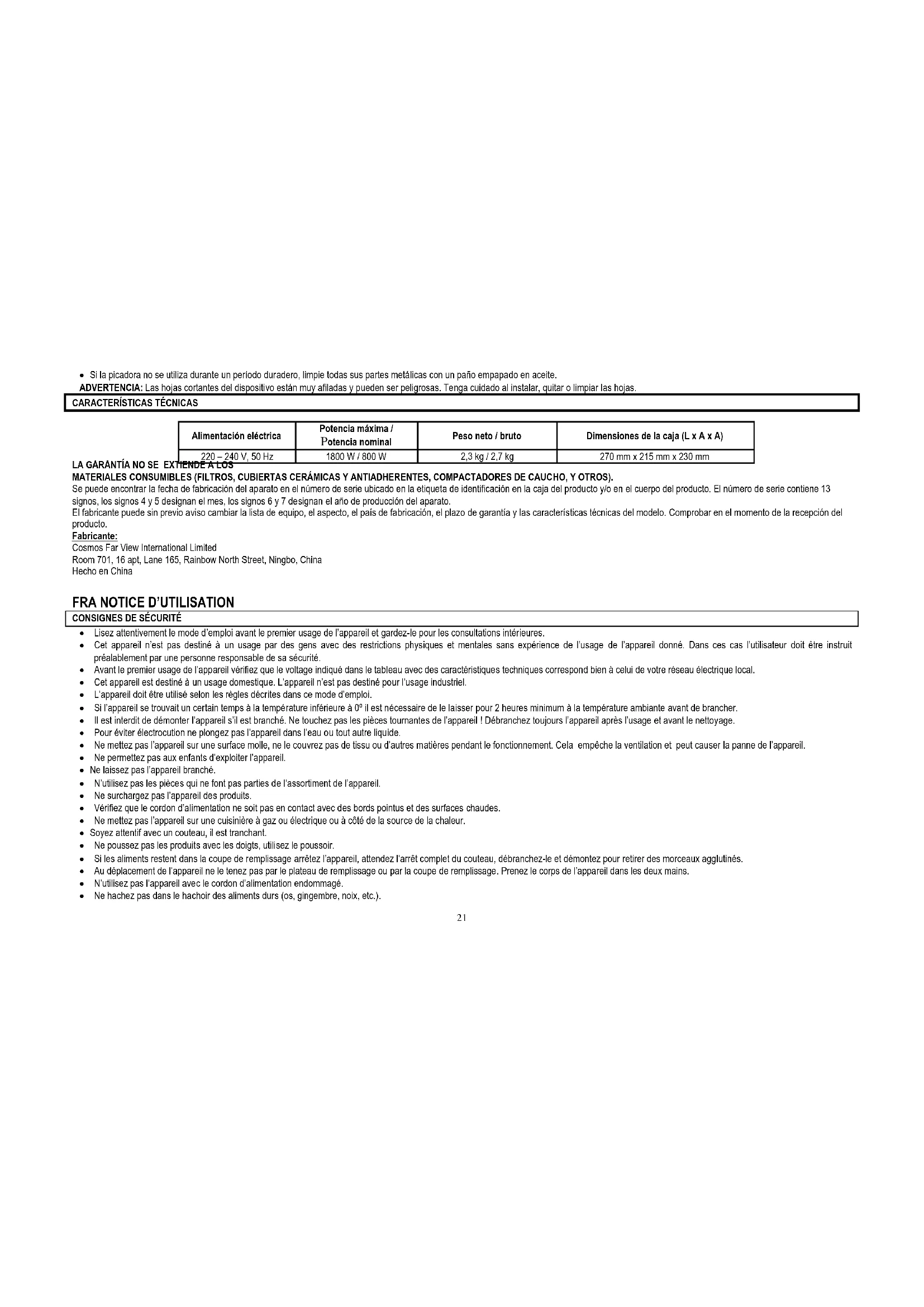 Lisez attentivement le mode d’emploi avant le premier usage de l’appareil et gardez-le pour les consultations intérieures. Cet appareil n’est pas destiné à un usage par des gens avec des restrictions physiques et mentales sans expérience de l’usage de l’appareil donné. Dans ces cas l’utilisateur doit être instruit préalablement par une personne responsable de sa sécurité. Avant le premier usage de l’appareil vérifiez que le voltage indiqué dans le tableau avec des caractéristiques techniques correspond bien à celui de votre réseau électrique local. Cet appareil est destiné à un usage domestique. L’appareil n’est pas destiné pour l’usage industriel. L’appareil doit être utilisé selon les règles décrites dans ce mode d’emploi. Si l’appareil se trouvait un certain temps à la température inférieure à 0º il est nécessaire de le laisser pour 2 heures minimum à la température ambiante avant de brancher. Il est interdit de démonter l’appareil s’il est branché. Ne touchez pas les pièces tournantes de l’appareil ! Débranchez toujours l’appareil après l’usage et avant le nettoyage. Pour éviter électrocution ne plongez pas l’appareil dans l’eau ou tout autre liquide. Ne mettez pas l’appareil sur une surface molle, ne le couvrez pas de tissu ou d’autres matières pendant le fonctionnement. Cela empêche la ventilation et peut causer la panne de l’appareil. Ne permettez pas aux enfants d’exploiter l’appareil. Ne laissez pas l’appareil branché. N’utilisez pas les pièces qui ne font pas parties de l’assortiment de l’appareil. Ne surchargez pas l’appareil des produits. Vérifiez que le cordon d’alimentation ne soit pas en contact avec des bords pointus et des surfaces chaudes. Ne mettez pas l’appareil sur une cuisinière à gaz ou électrique ou à côté de la source de la chaleur. Soyez attentif avec un couteau, il est tranchant. Ne poussez pas les produits avec les doigts, utilisez le poussoir. Si les aliments restent dans la coupe de remplissage arrêtez l’appareil, attendez l’arrêt complet du couteau, débranchez-le et démontez pour retirer des morceaux agglutinés. Au déplacement de l’appareil ne le tenez pas par le plateau de remplissage ou par la coupe de remplissage. Prenez le corps de l’appareil dans les deux mains. N’utilisez pas l’appareil avec le cordon d’alimentation endommagé. Ne hachez pas dans le hachoir des aliments durs (os, gingembre, noix, etc.). Alimentación eléctrica Potencia máxima / Potencia nominal Peso neto / bruto Dimensiones de la caja (L х A х A) 220 – 240 V, 50 Hz 1800 W / 800 W 2,3 kg / 2,7 kg 270 mm х 215 mm х 230 mm22 Le temps maximal recommandé du fonctionnement continu est jusqu’à 5 minutes avec une pause obligatoire de 10 minute minimum. Si le système de la protection contre la surchauffe du moteur se met en marche ne branchez pas l’appareil avant son refroidissement complet. Ne réparez jamais l’appareil vous-même. En cas des problèmes du fonctionnement de l’appareil contactez le réparateur agréé. Pendant l’usage de l’appareil le bloc du hachoir a un petit jeu ce qui n’est pas un défaut. Ne serez pas très fort la bague fixante pour arrêter le fonctionnement cela peut entraîner une panne. Les pièces métalliques amovibles du hachoir (vis, grilles, couteau) peuvent s’oxyder après l’usage. Cela est normal et ne représente pas un défaut.