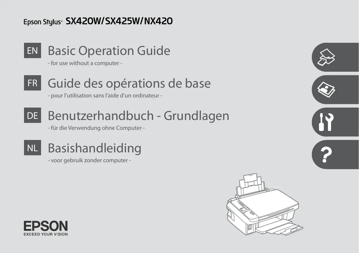 Téléchargez la notice de votre Imprimante multifonction au format PDF gratuitement ! Retrouvez votre notice SX425W - EPSON et reprennez votre appareil électronique en main. Sur cette page sont publiés tous les documents nécessaires à l'utilisation de votre appareil SX425W de la marque EPSON.