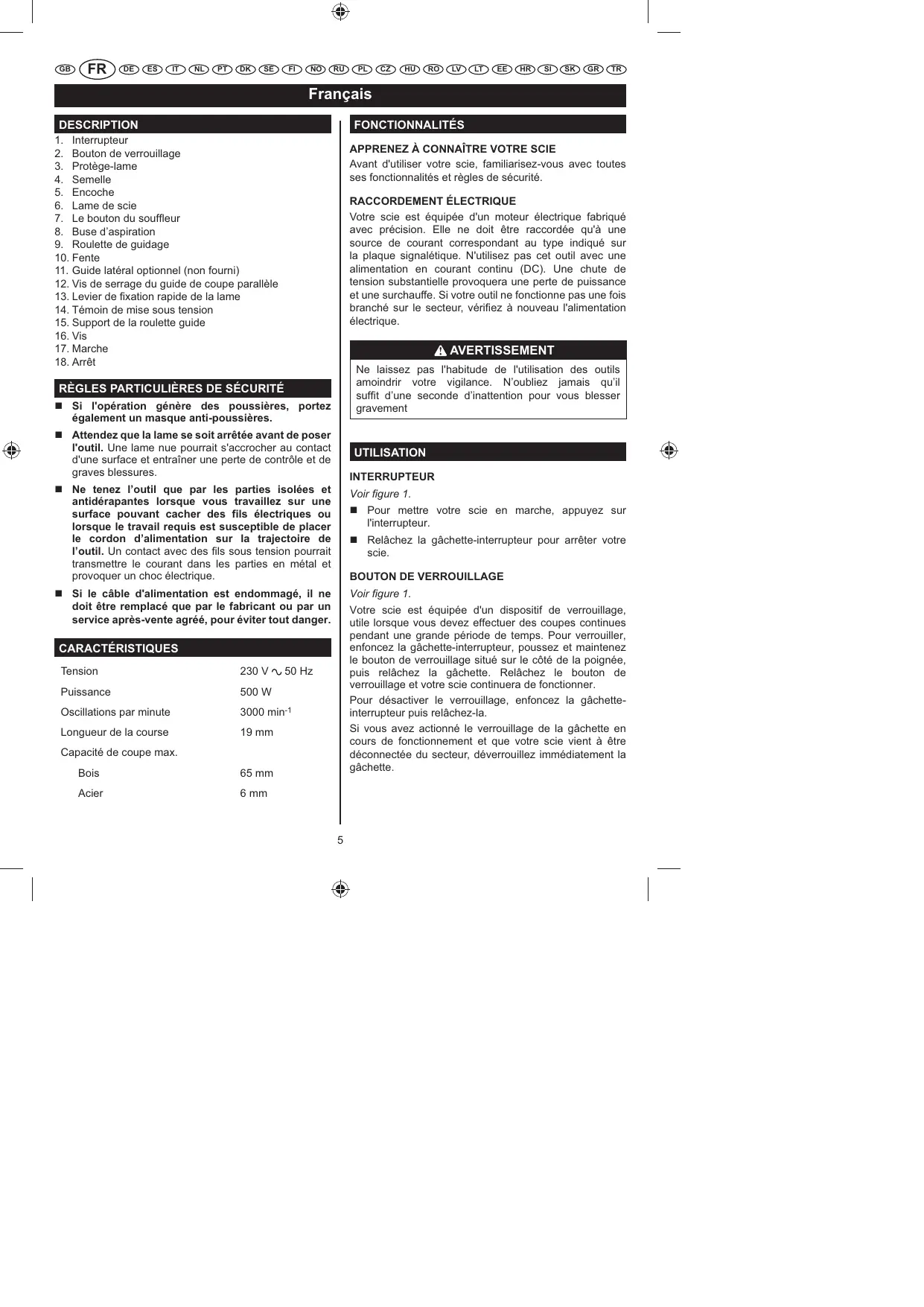 Si le câble d'alimentation est endommagé, il ne doit être remplacé que par le fabricant ou par un service après-vente agréé, pour éviter tout danger. Voir gure 1. Votre scie est équipée d'un dispositif de verrouillage, utile lorsque vous devez effectuer des coupes continues pendant une grande période de temps. Pour verrouiller, enfoncez la gâchette-interrupteur, poussez et maintenez le bouton de verrouillage situé sur le côté de la poignée, puis relâchez la gâchette. Relâchez le bouton de verrouillage et votre scie continuera de fonctionner. Pour désactiver le verrouillage, enfoncez la gâchetteinterrupteur puis relâchez-la. Si vous avez actionné le verrouillage de la gâchette en cours de fonctionnement et que votre scie vient à être déconnectée du secteur, déverrouillez immédiatement la gâchette. CARACTÉRISTIQUES Tension 230 V 50 Hz Puissance 500 W Oscillations par minute 3000 min-1 Longueur de la course 19 mm Capacité de coupe max. Bois 65 mm Acier 6 mm